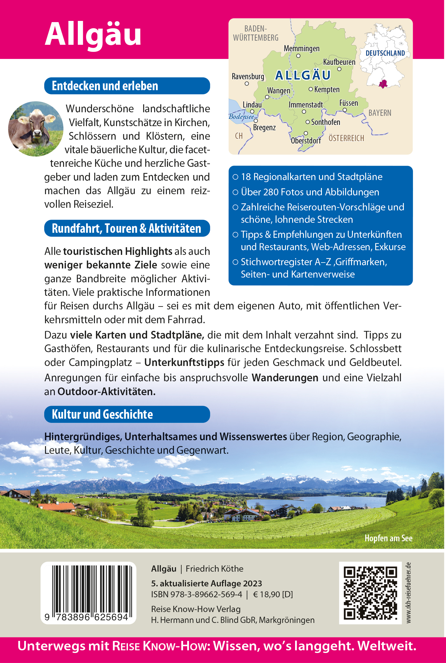 lt;p>Wunderschöne landschaftliche Vielfalt, Kunstschätze in Kirchen, Schlössern und Klöstern, eine vitale bäuerliche Kultur, die facettenreiche Küche und herzliche Gastgeber und laden zum Entdecken und machen das Allgäu zu einem reizvollen Reiseziel. Alle touristischen Highlights als auch weniger bekannte Ziele sowie eine ganze Bandbreite möglicher Aktivitäten. Viele praktische Informationen für Reisen durchs Allgäu - sei es mit dem eigenen Auto, mit öffentlichen Verkehrsmitteln oder mit dem Fahrrad. Dazu viele Karten und Stadtpläne, die mit dem Inhalt verzahnt sind. Tipps zu Gasthöfen, Restaurants und für die kulinarische Entdeckungsreise. Schlossbett oder Campingplatz - Unterkunftstipps für jeden Geschmack und Geldbeutel. Anregungen für einfache bis anspruchsvolle Wanderungen und eine Vielzahl an Outdoor-Aktivitäten. Hintergründiges, Unterhaltsames und Wissenswertes über Region, Geographie, Leute, Kultur, Geschichte und Gegenwart.