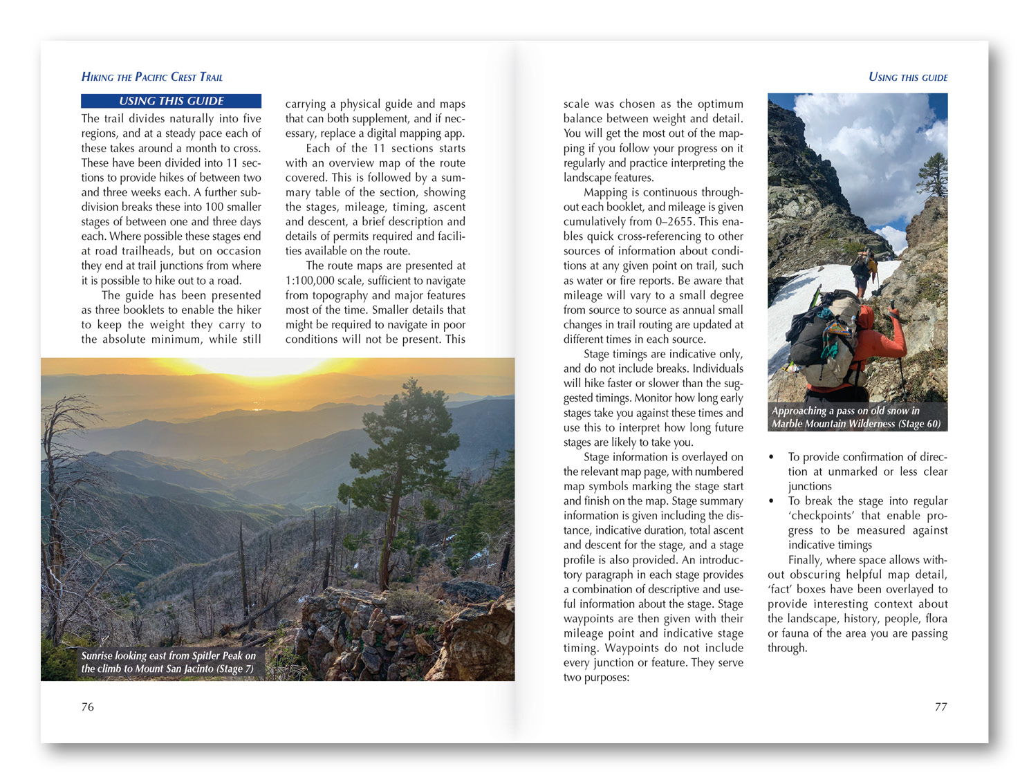 The two map books are designed to be used on the trail, one covering the southern stages from the Mexico border to northern California at Interstate 5, the other detailing the northern stages in Oregon and Washington to the Canadian border.