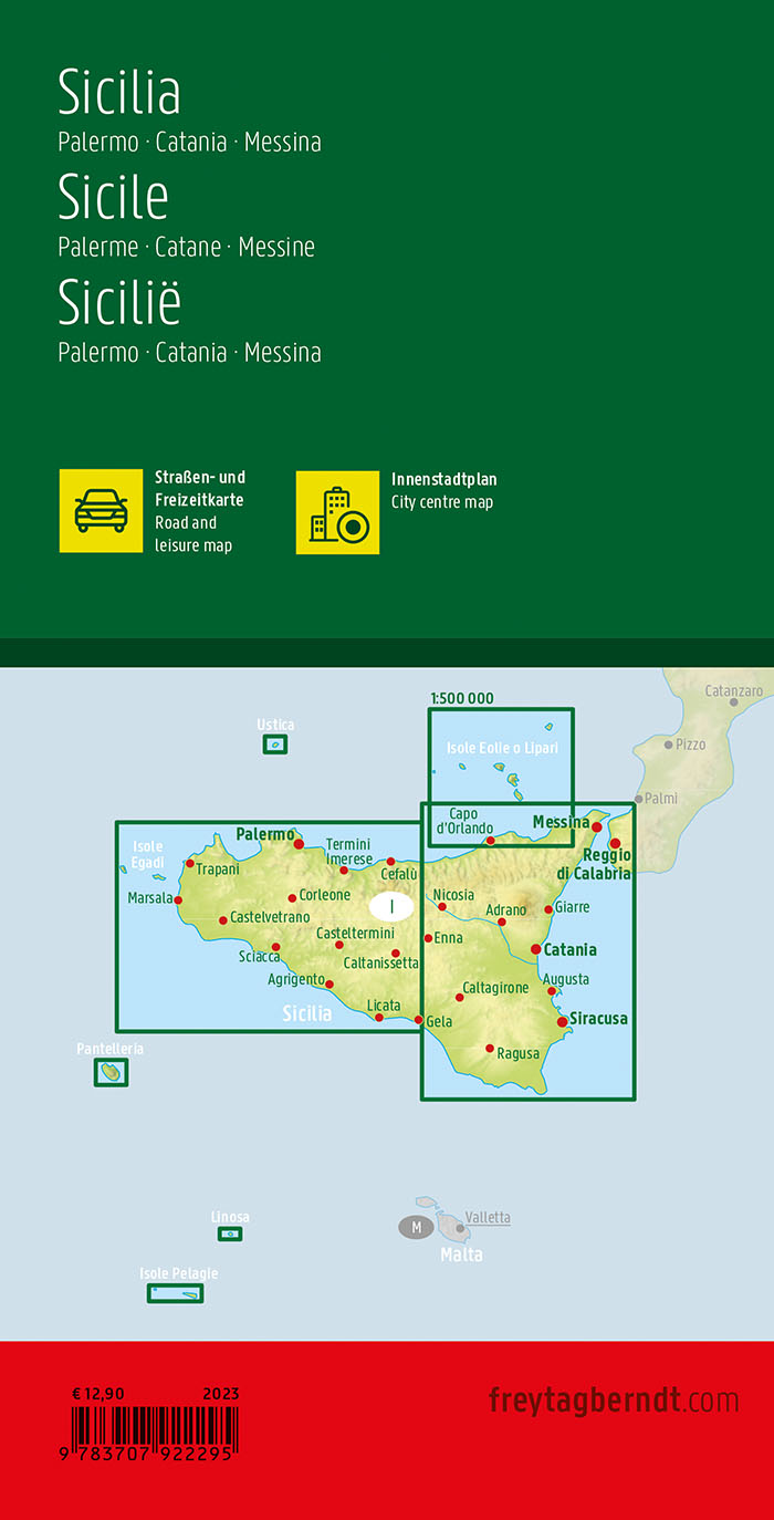 Mit der Straßenkarte Sizilien im Maßstab 1:150.000 finden sich Urlauber die mit Auto, Motorrad oder Wohnwagen unterwegs sind bestens zurecht. Das weit verzweigte Straßennetz ist exakt abgebildet, Entfernungen und viele Ausflugsziele sind in der Karte eingezeichnet.
