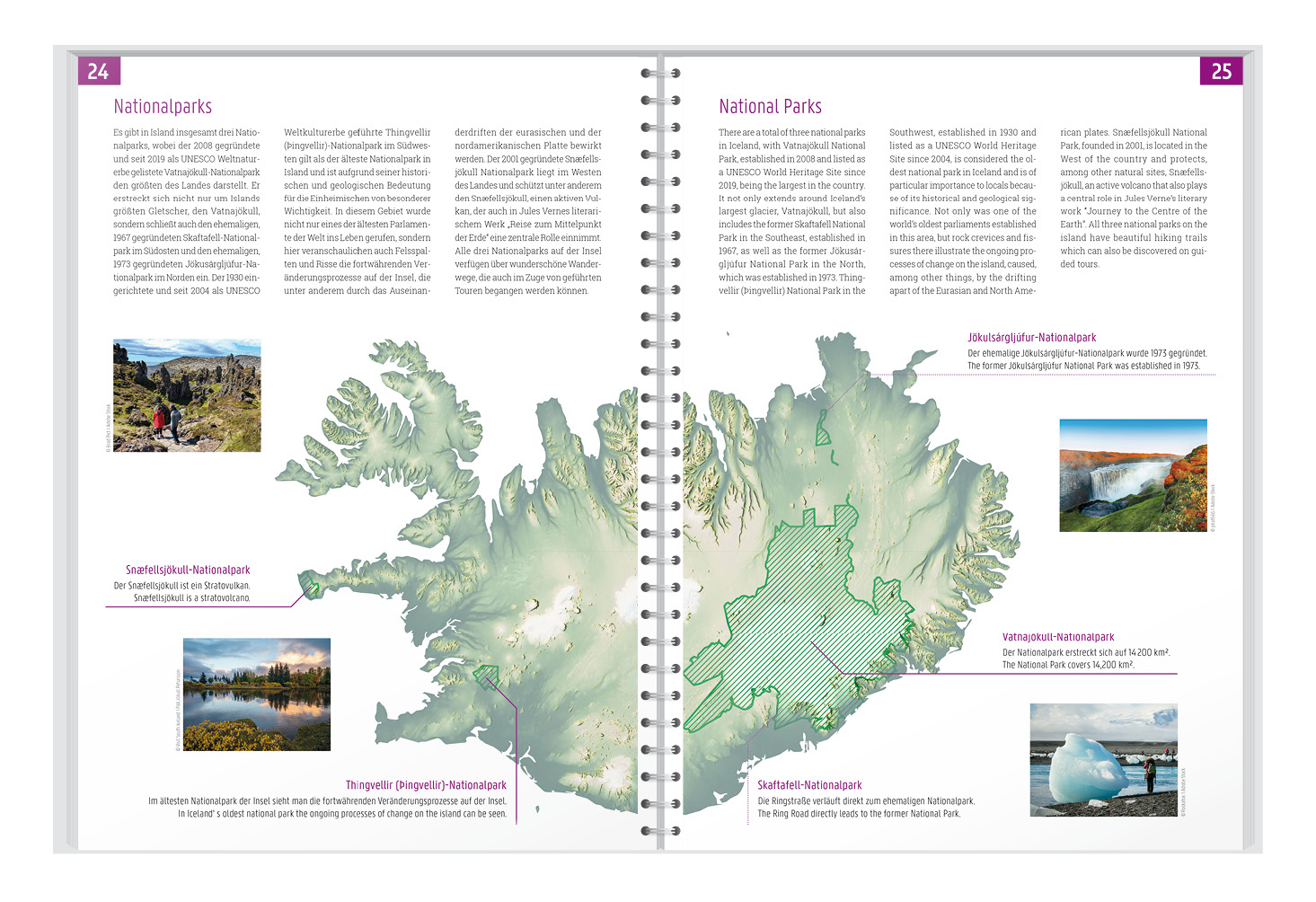 Damit sich Islandbesucher auf der Insel zurechtfinden, wurden in den Karten touristisch relevante Informationen, darunter Nationalparks und Naturschutzgebiete, schöne Ausblicke, Wasserfälle, heiße Quellen und beliebte Orte für die Walbeobachtung, visualisiert.