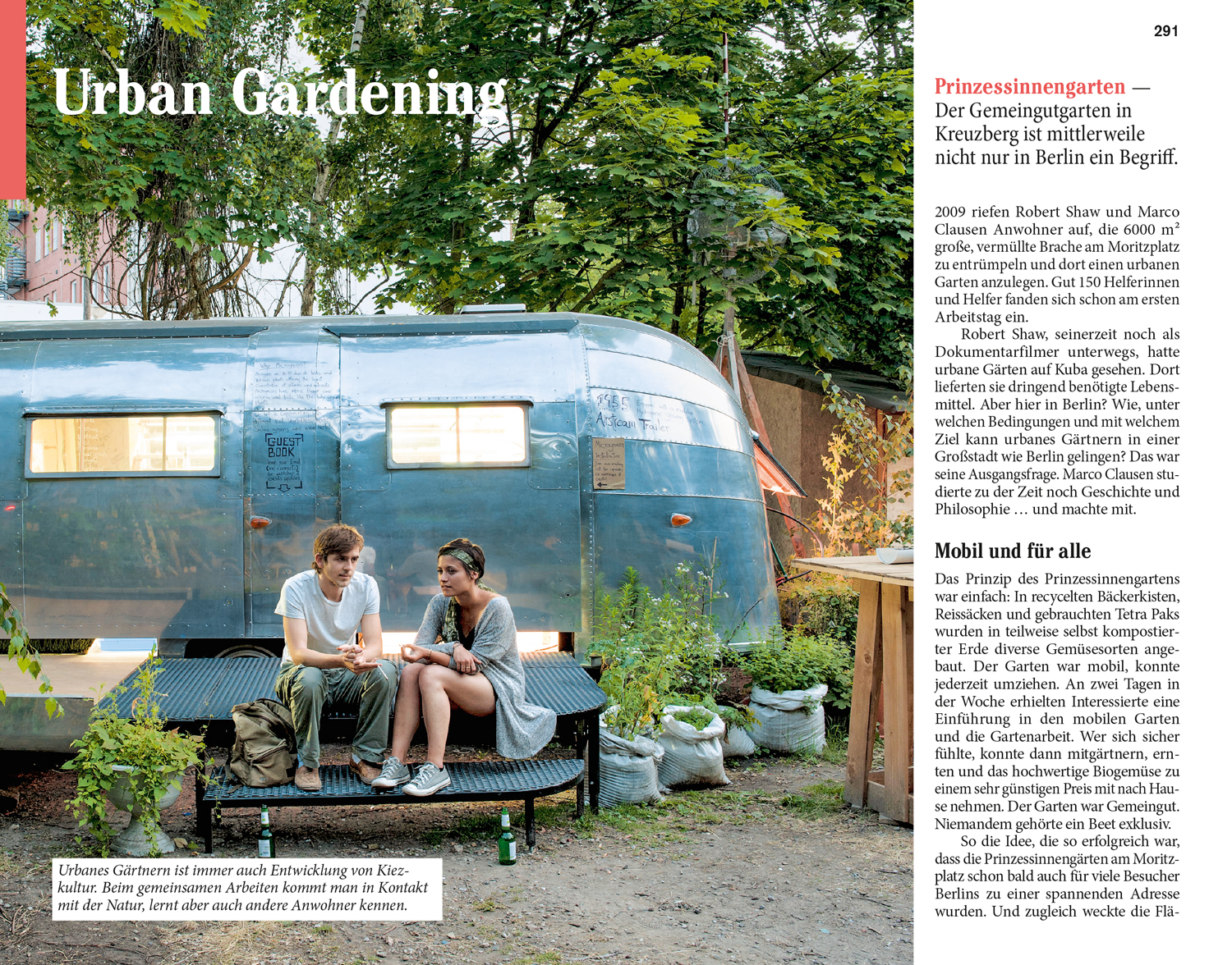 Senkrechtstarter, Überflieger, Kreuz und quer. Vor Ort - die Kapitel: Pariser Platz / Unter den Linden / Alt-Berlin, Die City (Ost), Im Berliner Osten, Tiergarten/Moabit/Schöneberg, City West und Alt-Charlottenburg, Spandauer Vorstadt, Prenzlauer Berg, Kreuzberg und Nord-Neukölln, Weiter draußen. Das Kleingedruckte (Reiseinfos von A bis Z). Das Magazin. Offene Fragen.