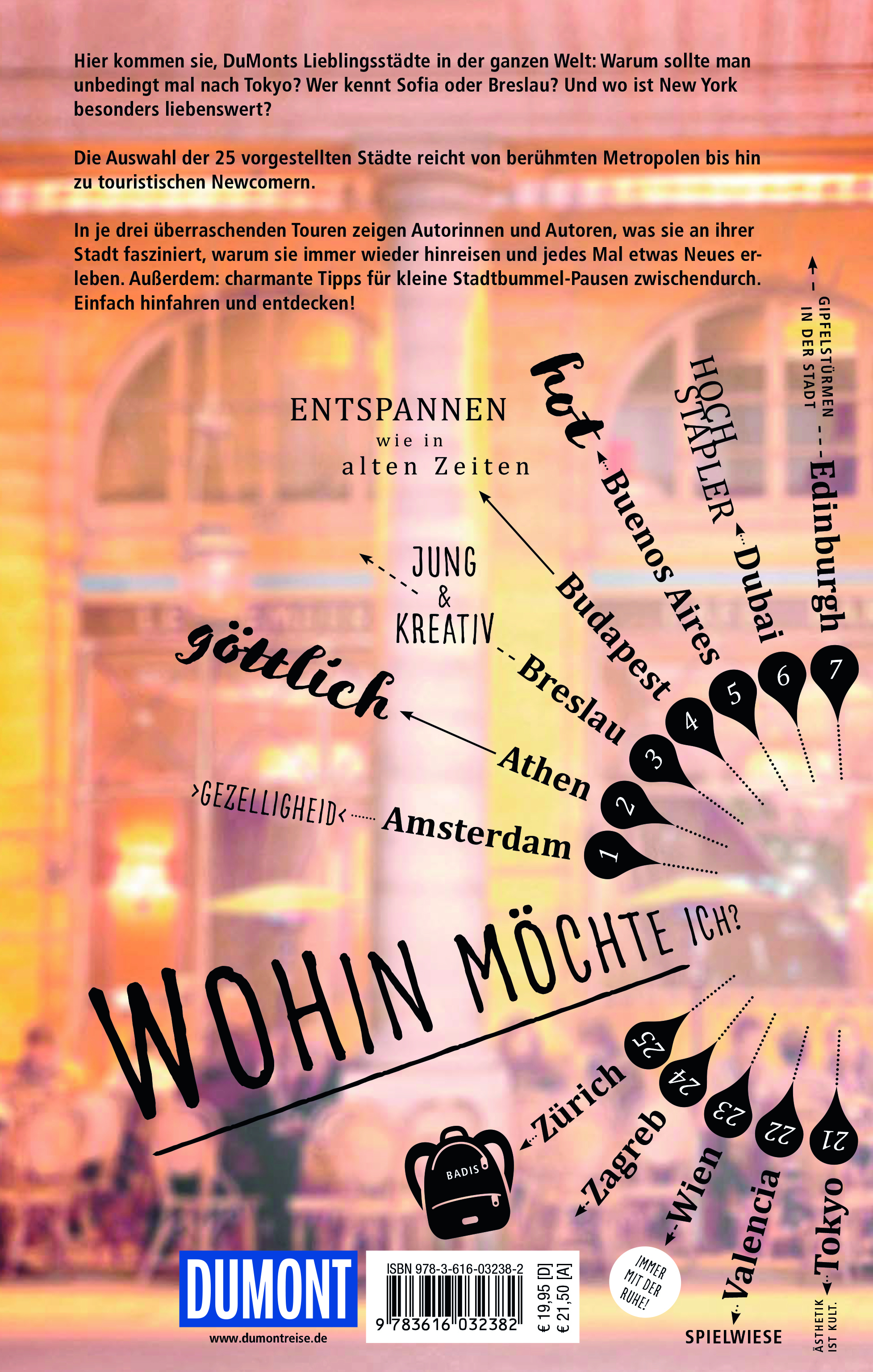 Hier sind sie, Dumonts Lieblingsstädte. Vorgestellt werden 25 liebenswerte Städte in der ganzen Welt, von berühmten Metropolen wie New York, Amsterdam oder Paris bis hin zu Newcomern wie Zagreb oder Valencia. In je drei Touren abseits der typischen Pfade zeigen unsere Autor:innen, was sie an ihrer Stadt fasziniert, warum sie immer wieder hinreisen und jedes Mal etwas Neues erleben. Außerdem: charmante Tipps für kleine Stadtbummel-Pausen zwischendurch. Einfach hinfahren und entdecken!