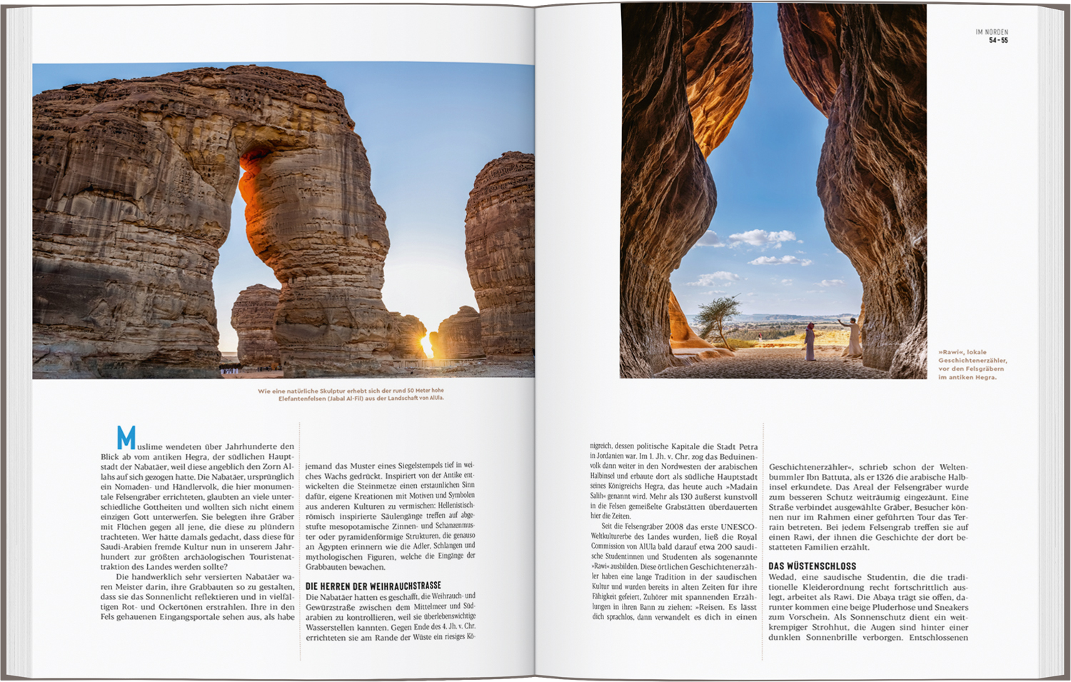 SESAM ÖFFNE DICH! Das Königreich Saudi-Arabien war für westliche Reisende lange Zeit verschlossen. Nun werden die Türen entriegelt. Denn heute ist den Saudis nichts wichtiger, als die eigene Attraktivität zu erhöhen und die Sichtbarkeit in einer globalisierten Welt zu gewährleisten. Mit antiken Stätten wie den monumentalen Felsengräbern bei Al Ula, die mit Jordaniens Petra konkurrieren können. Mit atemberaubenden Landschaften wie der Rub al-Khali-Wüste oder futuristischen Städten wie Riad, in denen man in Windeseile von historischen Palästen hinauf zur Aussichtsplattform eines High-Tech-Towers sausen kann. Vom Mittelalter in die Zukunft in Sekunden. Wo gibt es ein so unbekanntes Land noch zu entdecken? In Saudi-Arabien!