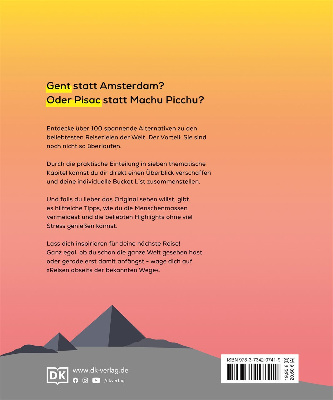Reisen abseits der bekannten Wege bietet dir eine Fülle an alternativen Reisezielen und verborgenen Reiseschätzen. Eine kleine Karte zeigt dir direkt, wo sich die Alternative befindet. Und falls es doch lieber das Original oder eine andere Region für die Reise sein soll, erhältst du Tipps, wie man auch die berühmten Sehenswürdigkeiten ohne viel Stress genießen kann und welche weiteren Alternativen existieren.