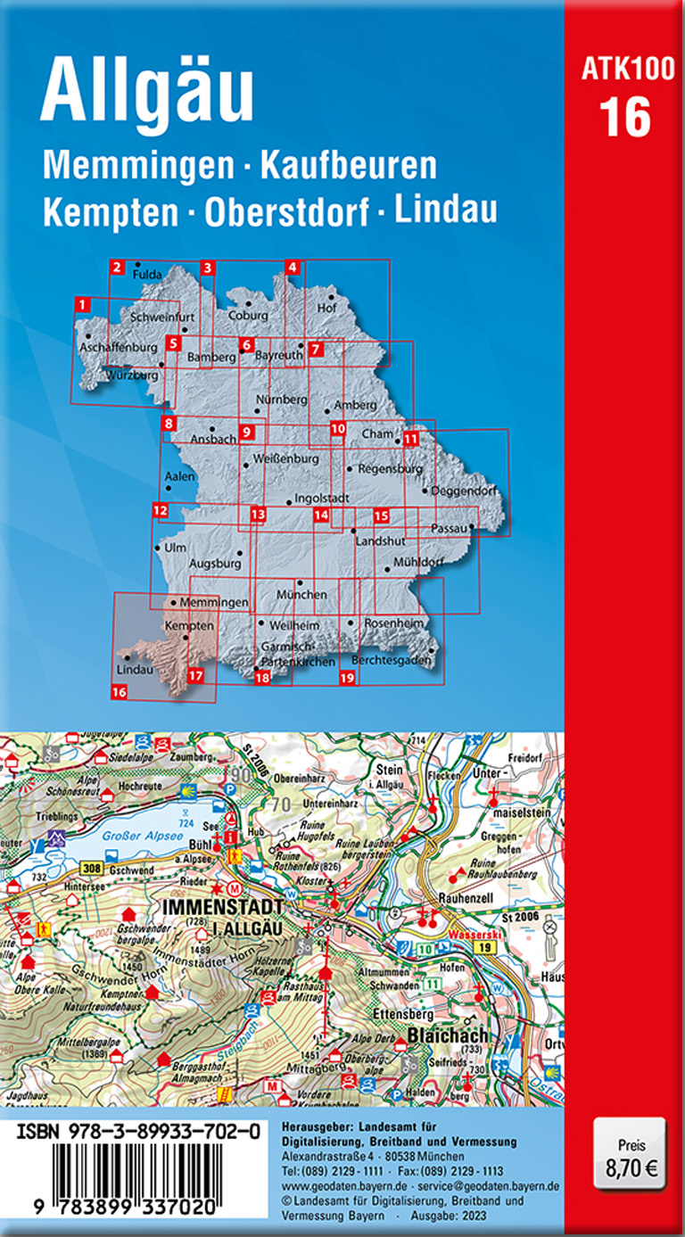 Für einen großräumigen Überblick bei weiten Touren liegt man mit der ATK100 genau richtig. Landschaftlich zusammenhängende Gebiete sind charakteristisch abgebildet, und der Karteninhalt ist auch im Maßstab 1 : 100 000 leicht verständlich.19 Einzelblätter stellen Bayern flächendeckend dar. Ein Kartenblatt umfasst ca. 85 km x 90 km.Was bietet die ATK100?- weiträumige Tourenplanung auf den ausgeschilderten Fernrad- und Fernwanderwegen- übersichtliche Darstellung großer Regionen- umfangreiches Spektrum an Freizeiteinrichtungen und Sehenswürdigkeiten- anschauliche Wiedergabe der GeländeformenAllgäu - welche Vielfalt! Im Westen Obstanbau am Bodensee und fruchtbare Wiesen und Felder im Norden. Im Süden locken sanfte Grashügel und die schroffen Allgäuer Alpen. Reich an Sehenswürdigkeiten ist Kempten, eine der ältesten Städte Deutschlands (die Römern nannten es cambodunum). Eine aktive Freizeitgestaltung ist im Allgäu durch seine ausgewogene Mischung aus Kultur, Natur, Sport und Erholung garantiert.Wanderlustige können zum Beispiel auf dem Premiumweg Wandertrilogie Allgäu, den Schlosspark-Etappenwegen oder dem Maximiliansweg die Natur genießen. Sportliche Radfahrer haben das Vergnügen, die hügelige Landschaft auf der Radrunde Allgäu zu erleben. Auf dem Bäderradweg locken die Thermen der Kurorte zu einem entspannten Wellness-Aufenthalt.Kinder dürfen im bewirtschafteten Allgäuer Bergbauernmuseum in Diepolz bei Immenstadt einen Kuhmagen begehen. Adrenalinliebhaber kommen in der längsten Ziplinebahn Deutschlands, dem Alpspitzkick, in Nesselwang auf ihre Kosten. Und das Beste: Entlang der vielen Freizeitwege und Attraktionen liegen unzählige Alpen, so heißen hier im Allgäu die Almen, um mit leckeren Brotzeiten und würzigem Allgäuer Bergkäse die Gäste zu verwöhnen.Kartenblatt ATK100-16 Allgäu:REGIONEN: Schwaben, Allgäu, Allgäuer Alpen, Bregenzer Wald, Kleinwalsertal, Kempter Wald, Tannheimer BergeORTE: Memmingen, Kaufbeuren, Kempten, Lindau, Sonthofen, Marktoberdorf, Diepolz, Nesselwang