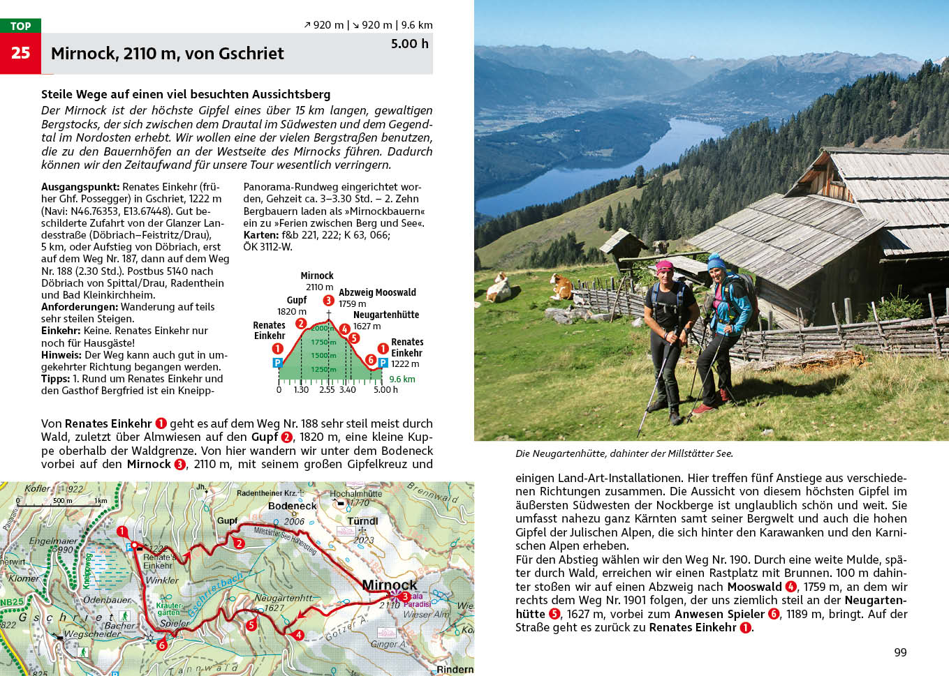 Zwischen dem Badeparadies der Kärntner Seen und dem Alpenhauptkamm mit den Hohen und Niederen Tauern liegt das einsame Wandergebiet Nockberge, das als Geheimtipp für Genießer und Entdecker gilt. Die Nockberge versprechen viel Genuss bei wenig Aufwand. Wegen der meist geringen Höhenunterschiede lassen sich fast alle Touren als Tagestouren durchführen. Neben zahlreichen Genusswanderungen werden auch zwei Touren auf die beiden attraktiven Dreitausender Schneewinkelspitze und Hafner beschrieben, die jeder geübte Bergsteiger verhältnismäßig leicht besteigen kann.