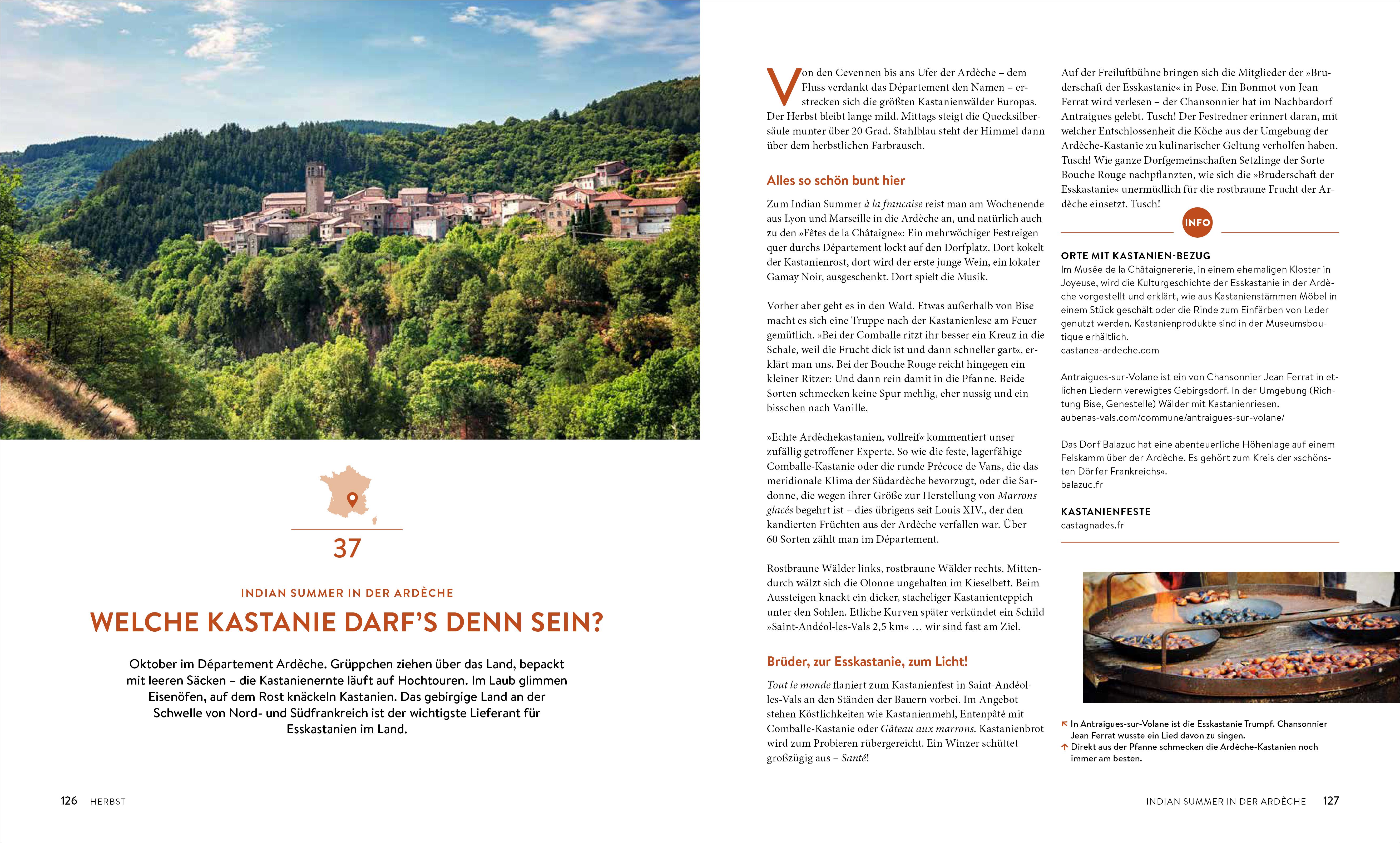 Überwintern im milden Klima der Côte d'Azur. Im späten Frühjahr zur Kirschblüte in die Provence. Im Sommer dann zum Insel-Hopping, Küstenwandern und Strandsegeln in die Bretagne. Und im Herbst schließlich zu den leuchtenden Kastanienwäldern der Ardèche oder zur Weinlese ins Elsass. Frankreich hat immer Saison. Man muss nur wissen, wo. Folgen Sie einfach den Inspirationen dieses Reiseführers und finden Sie für jede Jahreszeit das richtige Ziel im Lieblingsreiseland Frankreich.