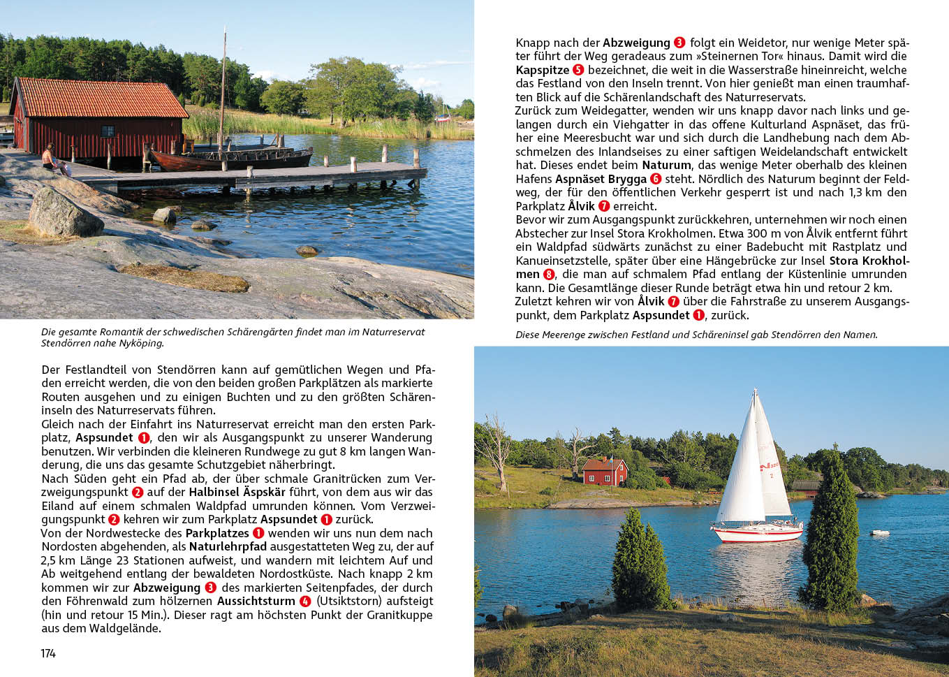 Die Palette reicht von Parkspaziergängen über Kulturwanderungen zu Schlössern und prähistorischen Funden bis zu ausgedehnten Streifzügen durch Wälder und Fjälllandschaften. Viele familienfreundliche Tages- und Halbtageswanderungen stellen den Landschaftsgenuss in den Vordergrund, es finden sich aber auch anspruchsvolle Touren in entlegenen Gebieten. Einige Wanderungen führen durch das liebliche Småland, die Heimat Astrid Lindgrens. Auch die Umgebung der Hauptstadt Stockholm bietet interessante Wandermöglichkeiten - unter anderem im Ekopark, dem ersten National-Stadtpark der Welt, und im Schärengarten. So lassen sich kulturelle Interessen mit sportlichen Ambitionen und Naturerlebnis vortrefflich verbinden.