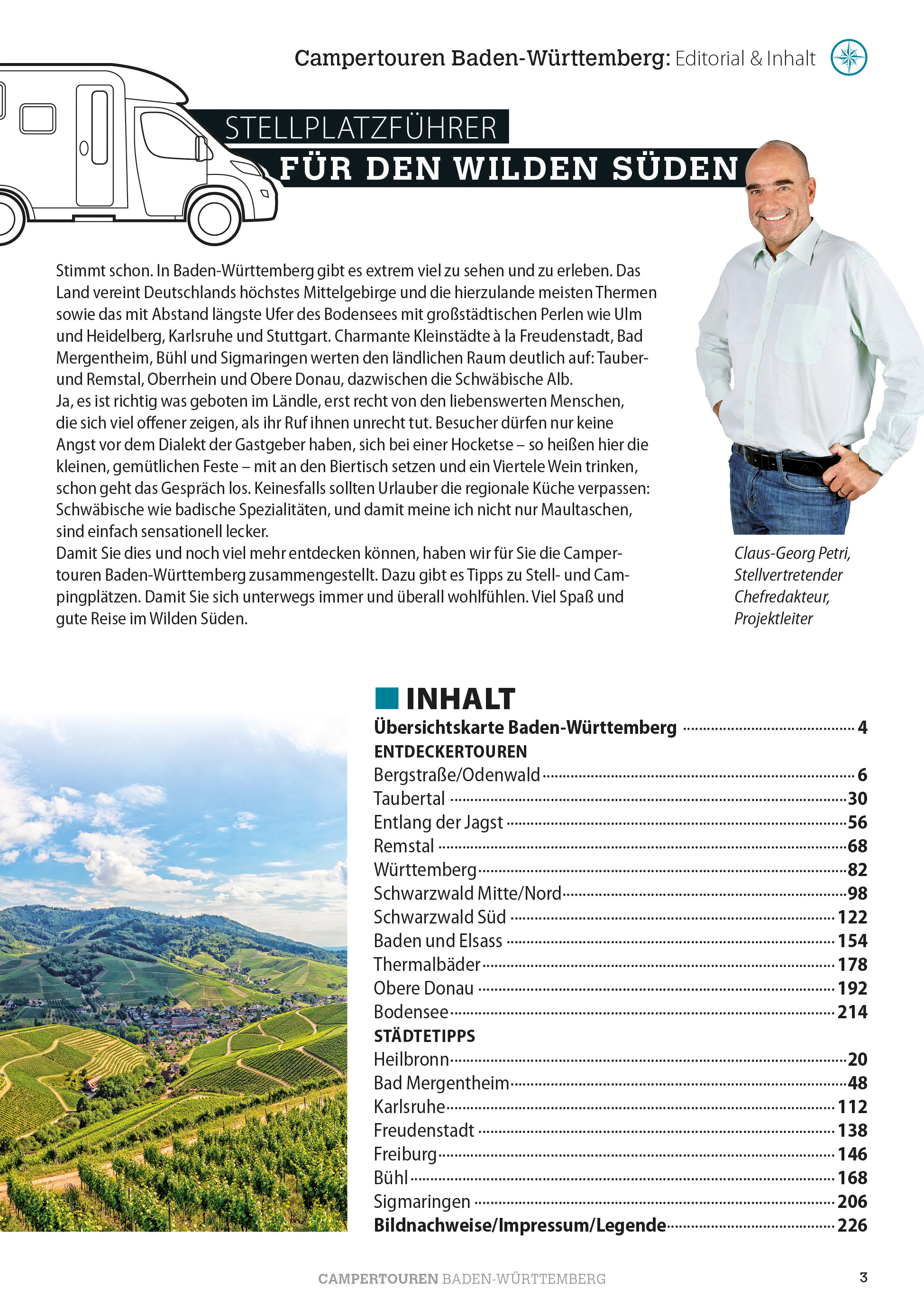 Redaktionelle Koordination durch Claus-Georg Petri:Claus-Georg Petri arbeitet seit 1995 als stellvertretender Chefredakteur für Reisemobil International. Er ist Experte fürReisen, schreibt Nachrichten, recherchiert wichtige Hintergründe zu Geschichten und koordiniert als Projektleiter seit 2019 ebenfalls die beliebte Buchreihe "Stellplatzführer, Erlebnis mit dem Wohnmobil". Auch privat geht er mit seiner Familie im Wohnmobil. Mit "Entdeckertouren" hat er nun eine neue Buchreihe eröffnet."Reisemobil International" erscheint monatlich als Fachzeitschrift und schreibt seit über 30 Jahren zu allen Themen rund umdas Wohnmobil. Die Redaktion veröffentlicht seit 26 Jahren jährlich den großen BORDATLAS Stellplatzführer sowie seit 2019 die Buchreihe "Stellplatzführer, Erlebnis mit dem Wohnmobil" zu vielen verschiedenen Themen und Hobbys von den schönsten Thermen über Urige Brauereien bis hin zu Naturparks oder Urlaub mit dem Hund.