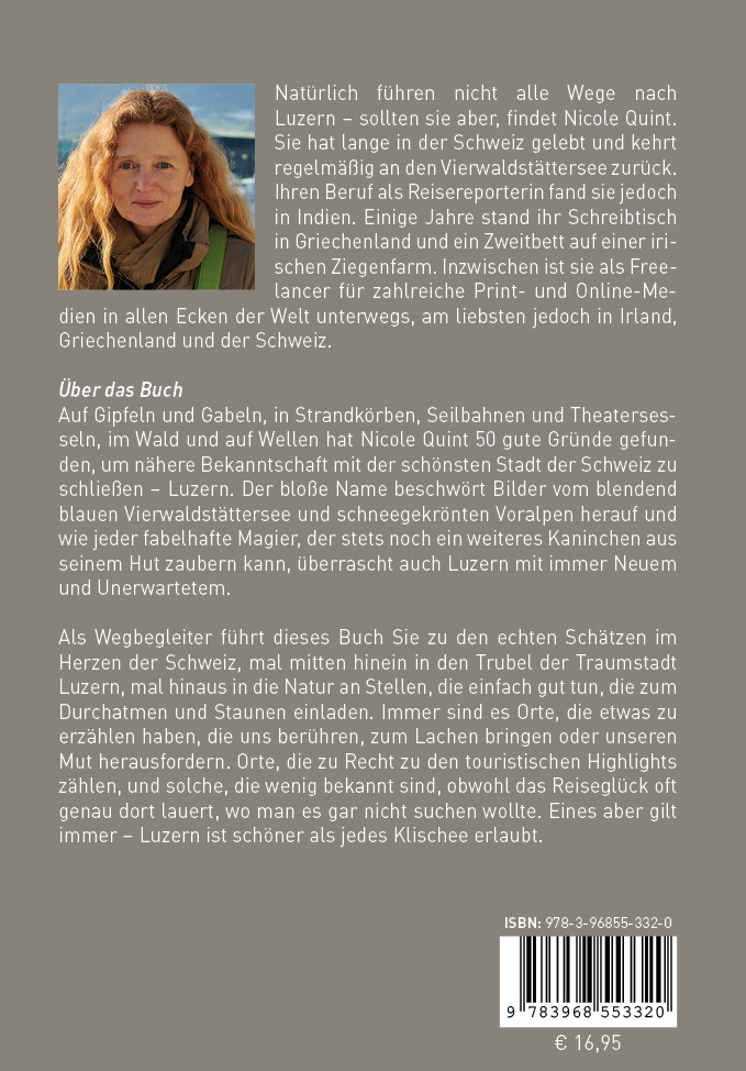 Natürlich führen nicht alle Wege nach Luzern – sollten sie aber, findet Nicole Quint. Sie hat lange in der Schweiz gelebt und kehrt regelmäßig an den Vierwaldstättersee zurück. Ihren Beruf als Reisereporterin fand sie jedoch in Indien. Einige Jahre stand ihr Schreibtisch in Griechenland und ein Zweitbett auf einer irischen Ziegenfarm. Inzwischen ist sie als Freelancer für zahlreiche Print- und Online-Medien in allen Ecken der Welt unterwegs, am liebsten jedoch in Irland, Griechenland und der Schweiz.