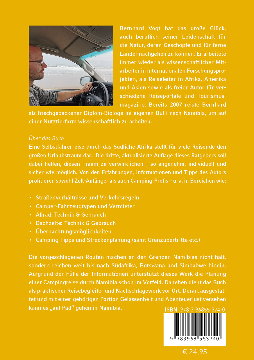 Bernhard Vogt hat das große Glück, auch beruflich seiner Leidenschaft für die Natur, deren Geschöpfe und für ferne Länder nachgehen zu können. Er arbeitete immer wieder als wissenschaftlicher Mitarbeiter in internationalen Forschungsprojekten, als Reiseleiter in Afrika, Amerika und Asien sowie als freier Autor für verschiedene Reiseportale und Tourismusmagazine. Bereits 2007 reiste Bernhard als frischgebackener Diplom-Biologe im eigenen Bulli nach Namibia, um auf einer Nutztierfarm wissenschaftlich zu arbeiten.