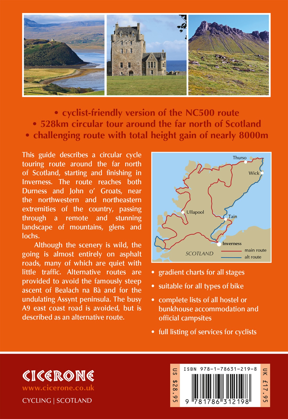 A guidebook to the 850km (528 mile) NC500 cycle route around northern Scotland. This circular tour starting and finishing in Inverness and passing through Wester Ross, Sutherland, Caithness, Easter Ross and the Black Isle is suitable for all types of bikes, and cyclists with a good level of fitness. The NC500 can be cycled in 2 weeks.
