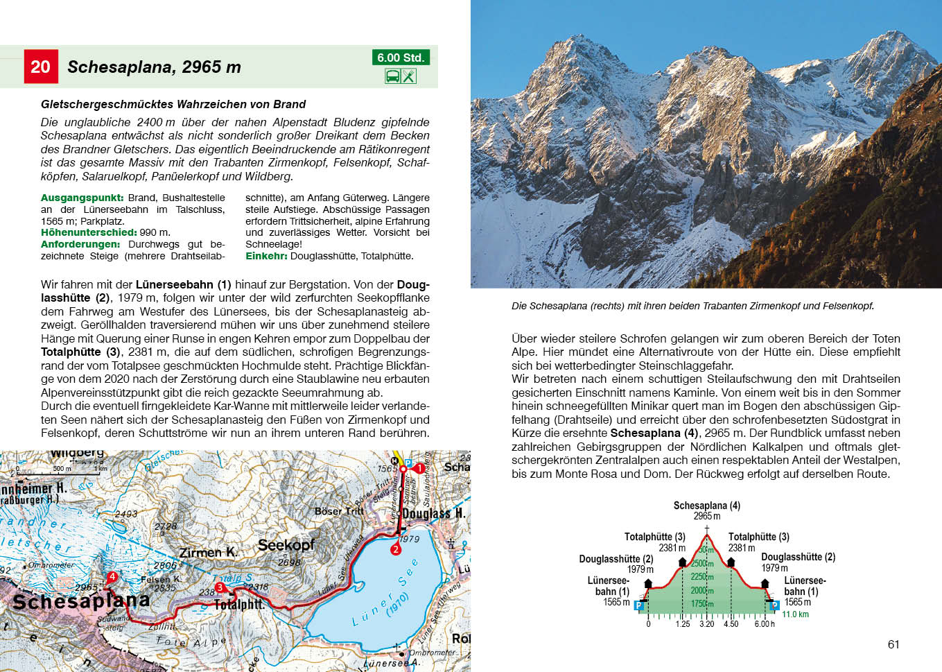 Die Landschaft des Brandnertals ist einfach einmalig und beim Wandern offenbart sich die grandiose Gipfelwelt. Besonders majestätisch ist die Schesaplana, höchster Gipfel und vergletschertes Wahrzeichen des Rätikons, mit dem wunderschönen Lünersee, der »Perle des Rätikons«. Das Große Walsertal zeichnet sich vor allem durch grüne Grasberge aus. Auf historischen Walserwegen taucht man in die noch unverfälschte Berglandschaft ein und erlebt die reiche kulturelle Vergangenheit des Tals. Wunderschön wandern lässt es sich auch rund um die Stadt Bludenz und das zum Arlberg verlaufende Klostertal. Stille Wald- und Höhenwanderungen, herrliche Aussichtsgipfel wie der Hohe Frassen, der Bludenzer Hausberg, und schöne Almen garantieren abwechslungsreiche Wandertage.