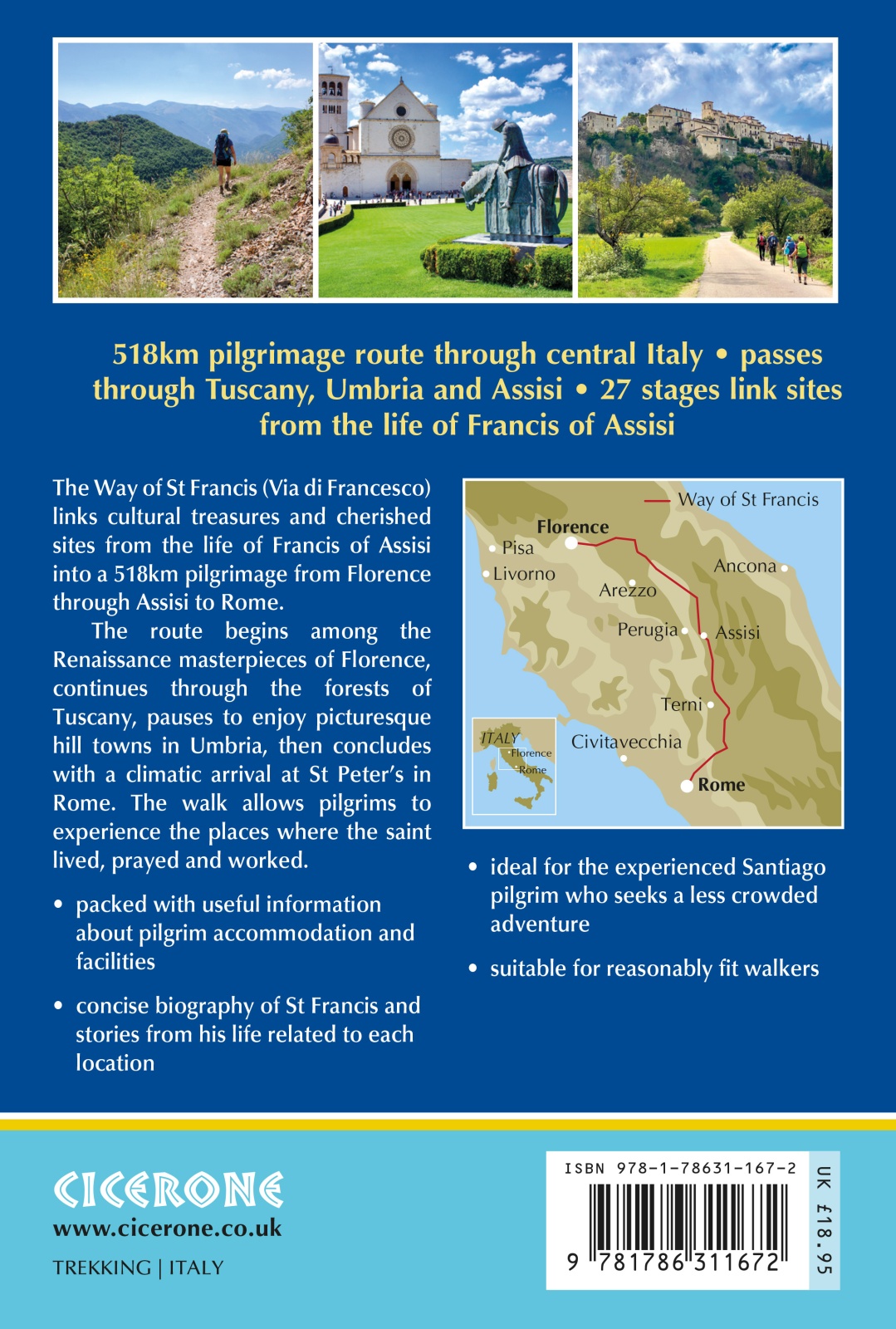 A guidebook to walking the Way of St Francis (Via di Francesco) between Florence and Rome. Covering 518km (322 miles), this pilgrimage route through Italy's Tuscany and Umbria takes around 1 month and is suitable for any reasonably fit walker.