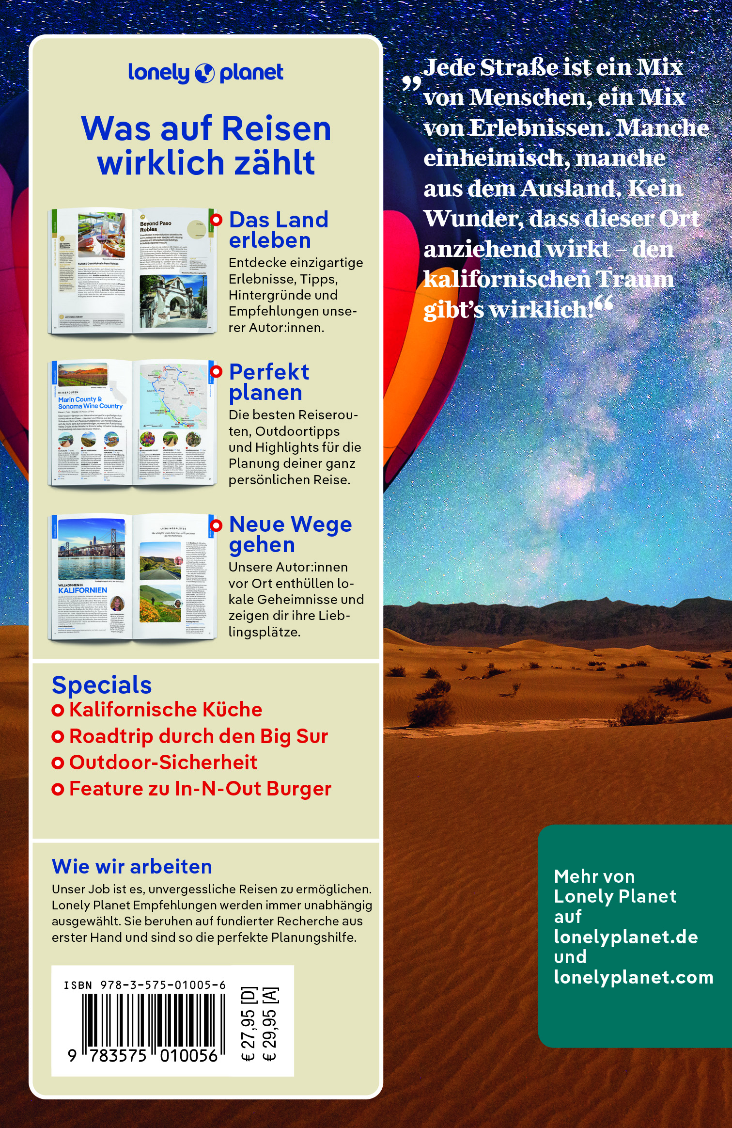 ... schon der Name weckt Reiselust. Mit dem Lonely Planet auf eigene Faust durch den Golden State und es kann nichts mehr schief gehen. Über 600 Seiten reisepraktische Informationen und Tipps, plus alles, was man wissen muss über die Destination, die nie aus der Mode kommt. Zu Recht: Wüstenlandschaften, zerklüftete Gipfel, von Gletscher geformte Täler, Wasserfälle und Bergwiesen im Landesinneren, palmengesäumte Boulevards und Strandleben und Surfkultur an der Küste. Das Expertenteam hat Tipps für Sightseeing, Aktivurlaub und Relaxen zusammengestellt. Der Guide führt zu Traumstränden und Wandertrails, schrulligen Museen und skurrilen Insider-Bars auch abseits der Touristenpfade. Ob Backpacker, Pauschalreisende oder 5-Sterne-Tourist - mit dem Lonely Planet im Gepäck bist du garantiert bestens gerüstet.