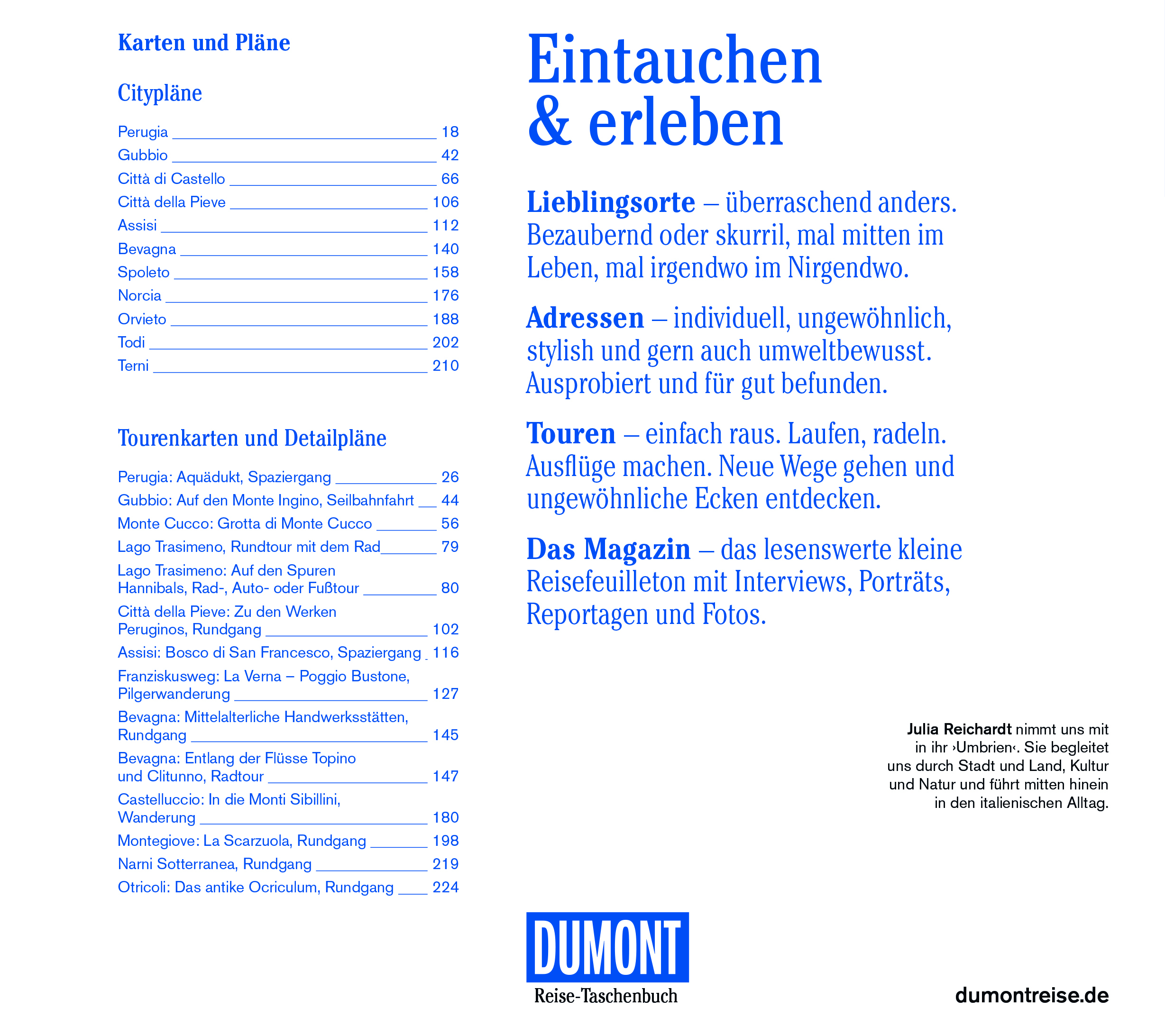 Senkrechtstarter, Überflieger, Querfeldein. Vor Ort - die Kapitel: Perugia und Umgebung. Gubbio und der Norden. Lago Trasimeno. Assisi und Umgebung. Valle Umbra. Die Valnerina. Orvieto und Umgebung. Terni und der Süden. Das Kleingedruckte (Reiseinfos von A bis Z). Das Magazin. Offene Fragen.