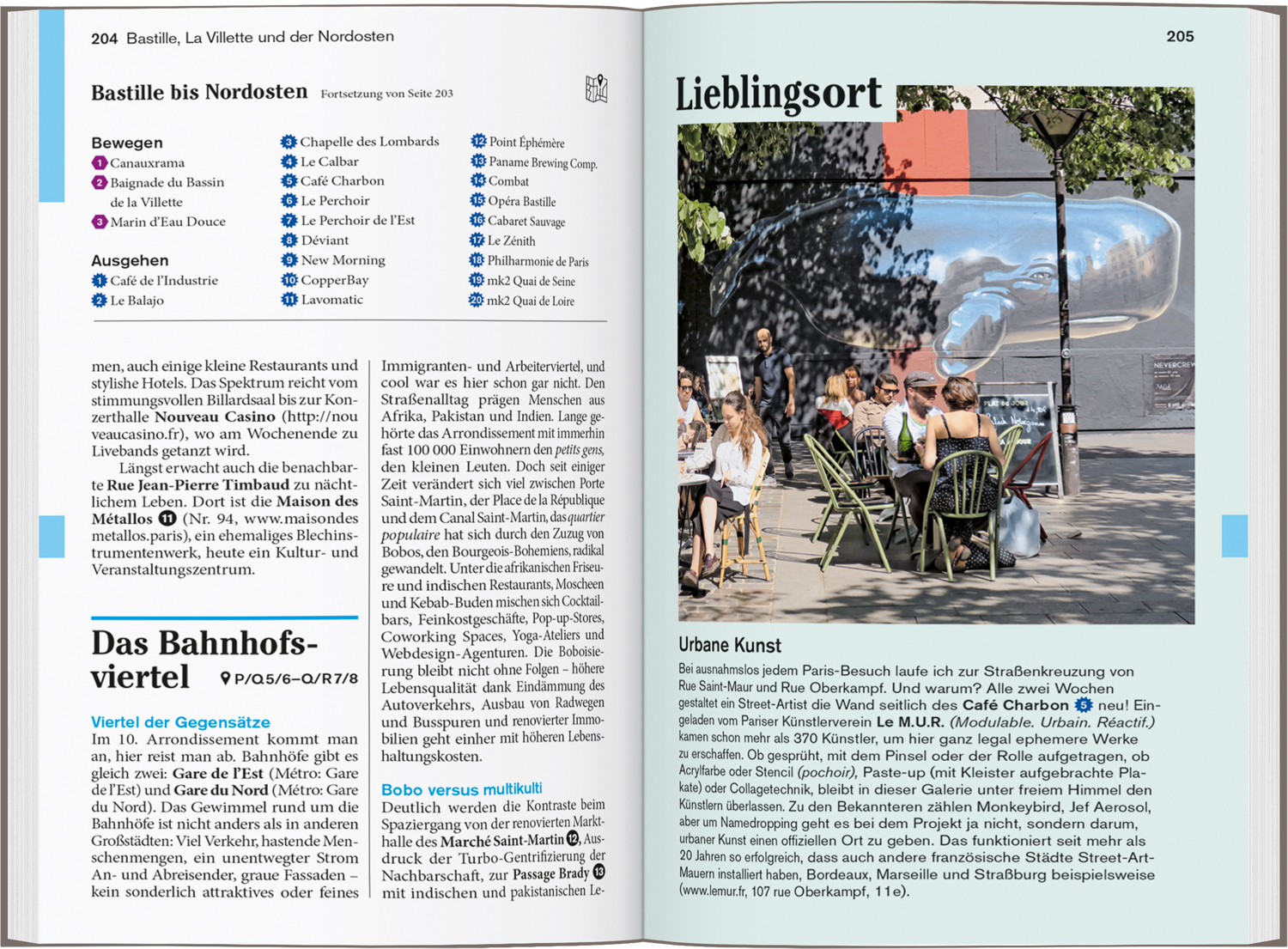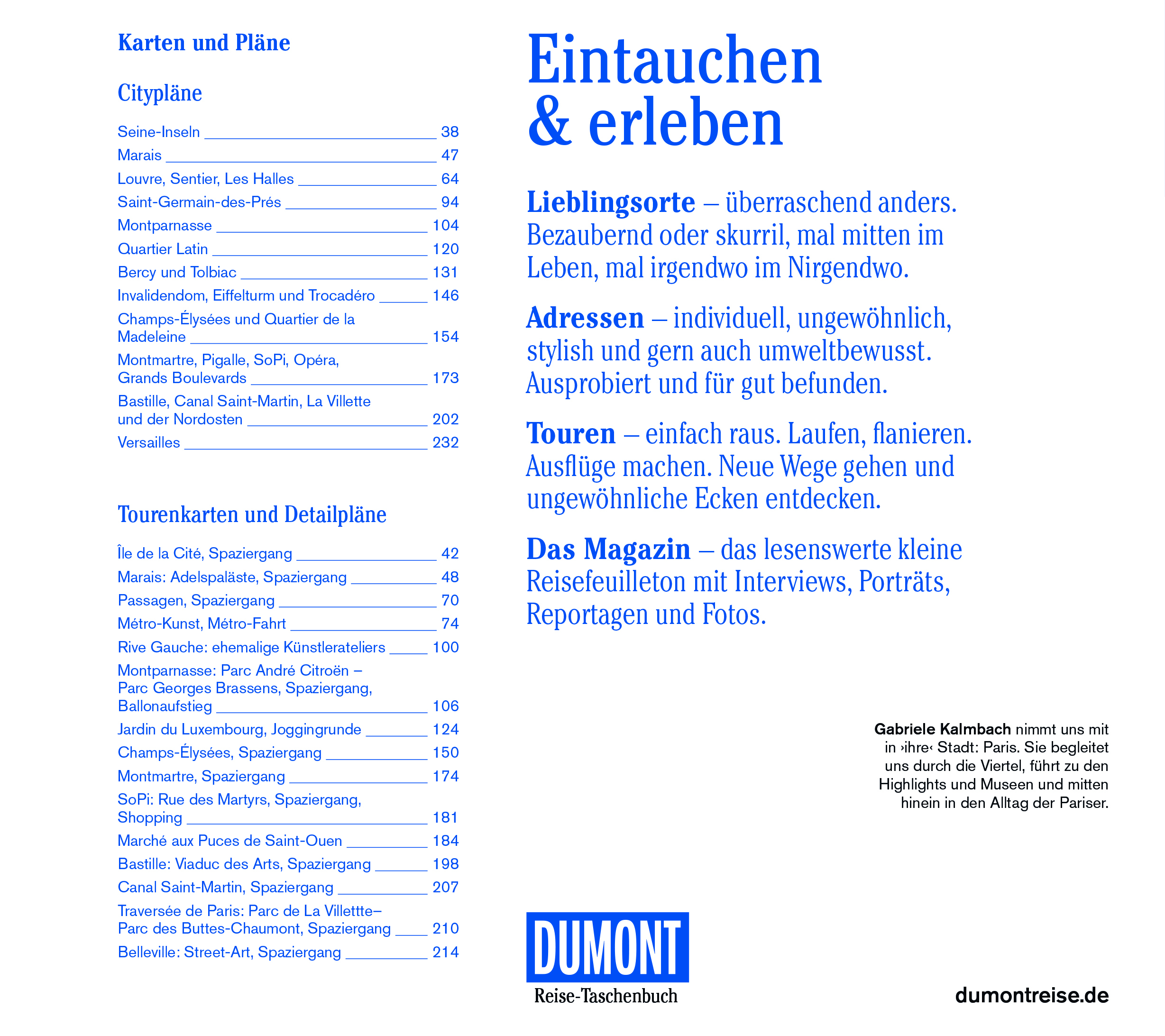 Senkrechtstarter, Überflieger, Kreuz und quer, Stadtlandschaften. Ausgewählte Paris-Adressen: Essen ist mehr als satt werden, Flanieren & stöbern, Diese Museen lieben wir!, Nachtschwärmereien, Wo du schläfst, bist du zu Hause. Vor Ort - die Stadtviertel samt persönlichen Adresstipps: Seine-Inseln und Marais, Louvre, Sentier und Les Halles, Saint-Germain und Montparnasse, Quartier Latin, Bercy und Tolbiac, Eiffelturm, Trocadéro und Champs-Élysées, Montmartre, SoPi und Opéra, Bastille, La Villette und der Nordosten, Ausflüge. Das Kleingedruckte (Reiseinfos von A bis Z). Das Magazin. Offene Fragen.