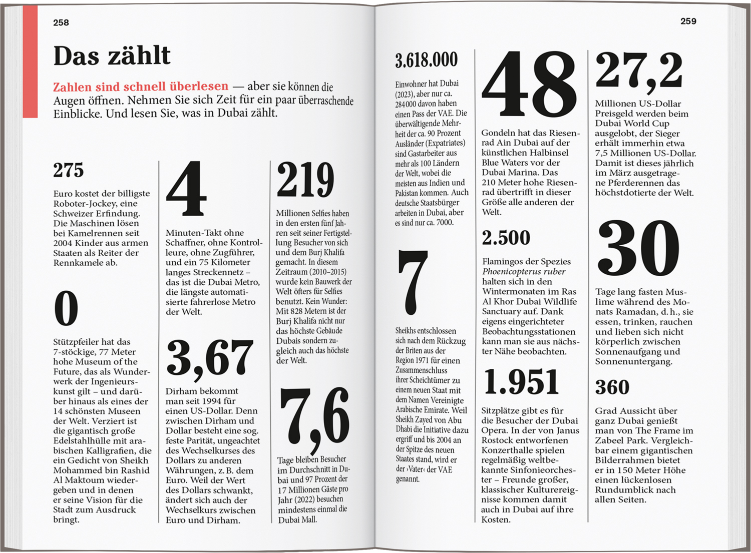 Senkrechtstarter, Überflieger, Querfeldein. Vor Ort - die Kapitel: Bur Dubai. Deira. An der Sheikh Zayed Road. Jumeirah. Jebel Ali. Ausflüge nach Sharjah, Abu Dhabi und Al Ain. Das Kleingedruckte (Reiseinfos von A bis Z). Das Magazin. Offene Fragen.