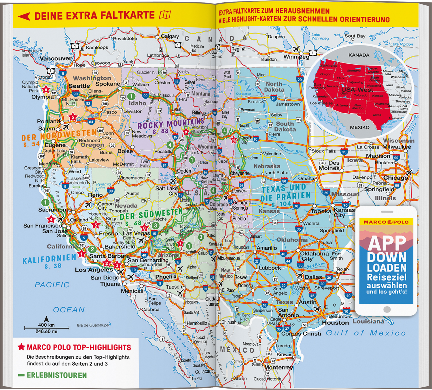 Mit dem MARCO POLO Reiseführer USA West hast du alle Regionen im Überblick: Von Kalifornien, über den Nordwesten mit Seattle und Portland, die Rocky Mountains mit Salt Lake City über den Südwesten mit Las Vegas bis nach Texas. In deinem MARCO POLO Reiseführer findest du alles, was du für deinen Urlaub brauchst: Wissenswertes zum Reiseziel und zur Anreise, Tipps für Übernachtungen, Shopping, Sport und einzigartige Erlebnistouren.