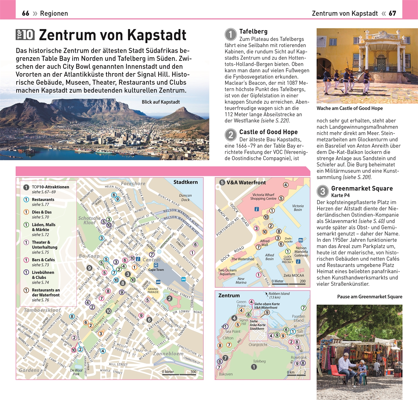 Erforschen Sie die südlichen Vororte mit ihren exklusiven Wohnanlagen, starten Sie eine Bootstour auf der Kap-Halbinsel oder entdecken Sie die unzähligen Weingüter im grünen Umland im TOP10 Kapstadt-Reiseführer werden die einzelnen Stadtteile und Ausflüge in die Umgebung übersichtlich und ausführlich porträtiert. Stimmungsvolle Fotos und detaillierte Stadtteil-Karten zeigen berühmte Sehenswürdigkeiten, charmante Stadtviertel sowie Restaurant-, Shopping- oder Tourenvorschläge auf einen Blick.