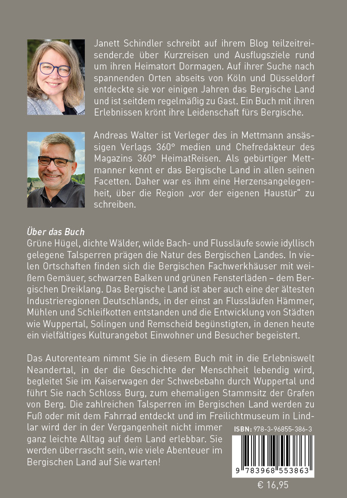 Andreas Walter ist Verleger des in Mettmann ansässigen Verlags 360° medien und Chefredakteur des Magazins 360° HeimatReisen. Als gebürtiger Mettmanner kennt er das Bergische Land in allen seinen Facetten. Daher war es ihm eine Herzensangelegenheit, über die Region „vor der eigenen Haustür“ zu schreiben.