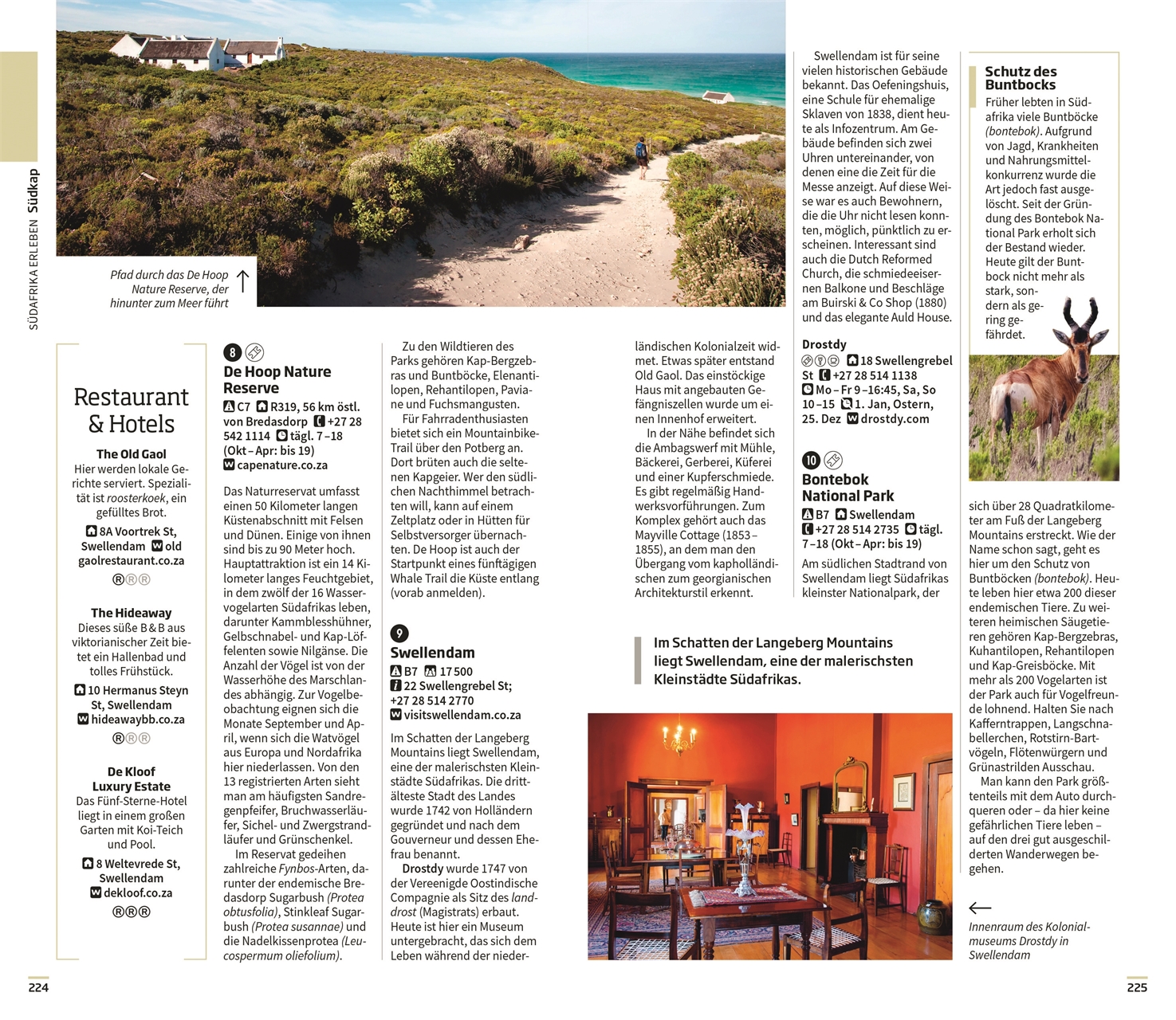 Die schönsten Regionen: Die fabelhaftesten Gegenden stellen sich Ihnen im Reiseführer Südafrika in ihrer gesamten Pracht vor mit fundierten und qualitativen Inhalten sowie unvergesslichen Highlights aus Kultur und Alltag. Von der wilden Region Limpopo, Mpumalanga und Kruger mit dem Kruger National Park an der Grenze zu Mosambik über KwaZulu-Natal, mit spektakulärer Landschaft wie den hohen Gipfeln der Drakensberge bis zur Kaphalbinsel, die am südlichsten Punkt am Kap der guten Hoffnung endet. Nicht zu vergessen die pulsierenden Städte Johannesburg und Kapstadt, die mit bunten Märkten, eindrucksvollen Museen zur Geschichte der Apartheid sowie trendigen Restaurants und einem vibrierenden Nachtleben aufwarten.