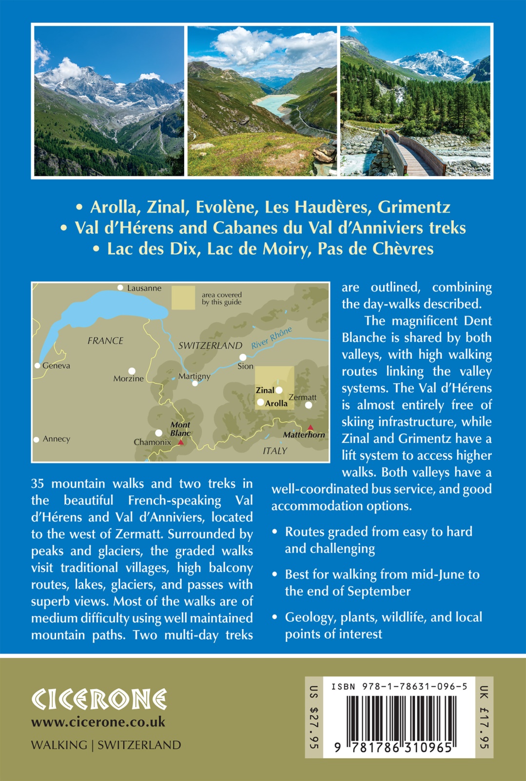 Guidebook describing 35 mountain walks in the beautiful scenery of Val dâHerens and Val dâAnniviers, located to the west of Zermatt. Surrounded by peaks and glaciers the graded walks include traditional villages, lakes and superb views. Most of the walks are of medium difficulty using well-maintained mountain paths. Two multi-day treks are outlined, combining the day-walks described.
