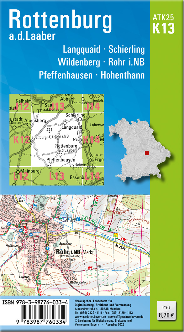 Wer es genau wissen will, greift zur ATK25. Diese Kartenserie im Maßstab 1:25000 bildet mit ihrer detaillierten Darstellung das komplette Verkehrsnetz mit allen Straßen und Wegen ab.237 Einzelblätter stellen Bayern flächendeckend dar. Ein Kartenblatt umfasst ca. 21 km x 22 km.Was bietet die ATK25?- individuelle Freizeitgestaltung mit allen ausgeschilderten Wander- und Radwanderwegen- sichere Orientierung auch abseits der markierten Routen- umfangreiches Spektrum an Freizeiteinrichtungen und Sehenswürdigkeiten- anschauliche Wiedergabe der GeländeformenKartenblatt ATK25-K13 Rottenburg a.d.Laaber:REGION: Niederbayern, Oberpfalz, Hallertau (Holledau)ORTE: Rottenburg a.d.Laaber, Langquaid, Schierling, Wildenberg, Rohr i.NB, Pfeffenhausen, Hohenthann, Herrngiersdorf