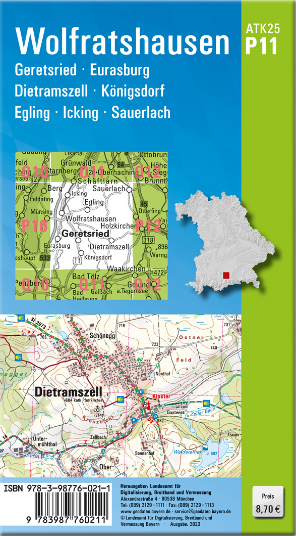 Wer es genau wissen will, greift zur ATK25. Diese Kartenserie im Maßstab 1:25000 bildet mit ihrer detaillierten Darstellung das komplette Verkehrsnetz mit allen Straßen und Wegen ab.237 Einzelblätter stellen Bayern flächendeckend dar. Ein Kartenblatt umfasst ca. 21 km x 22 km.Was bietet die ATK25?- individuelle Freizeitgestaltung mit allen ausgeschilderten Wander- und Radwanderwegen- sichere Orientierung auch abseits der markierten Routen- umfangreiches Spektrum an Freizeiteinrichtungen und Sehenswürdigkeiten- anschauliche Wiedergabe der GeländeformenKartenblatt ATK25-P11 Wolfratshausen:REGION: Oberbayern, Bayerisches OberlandORTE: Wolfratshausen, Geretsried, Eurasburg, Dietramszell, Königsdorf, Egling, Icking, Sauerlach