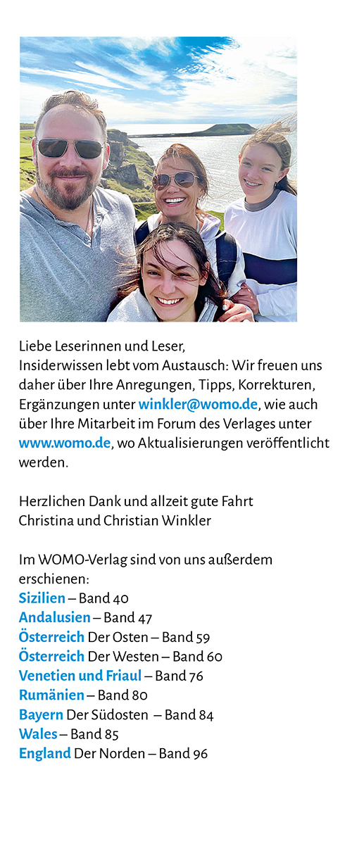Einladung Liebe Leserinnen und Leser, mit dem Erwerb dieses Buches haben Sie bereits den ersten Schritt getan, sich auf eine spannende Wohnmobilreise durch Südengland vorzubereiten. Wir möchten Sie ermutigen, diesem Vorhaben auch Taten folgen zu lassen. Im Süden Englands erwarten Sie faszinierende Herrenhäuser und Burgen wie Windsor und Knebworth, mystische Stätten wie Stonehenge und großartige weitere Freizeiterlebnisse wie der Safari- und Freizeitpark Longleat. Entdecken Sie dramatische Küstenlandschaften in Devon, weiße Kreidefelsen in Sussex, herrliche Strände und üppig-subtropische Gärten in Cornwall und lebendige Metropolen von Bristol über Oxford bis London. Ja, das Reisen durch England ist oft etwas anders als am europäischen Festland. Doch die Anpassung an den Linksverkehr geht schnell vonstatten, und die Freundlichkeit und Höflichkeit, die Ihnen nahezu überall, nicht nur im Straßenverkehr, entgegengebracht wird, sind bemerkenswert. Auch, wenn es kaum offizielle, freie Stellplätze gibt, ist die Befürchtung, keine guten Orte für die Nacht zu finden, unbegründet. Indem Sie sich auf eine Vielzahl von Möglichkeiten, wie gemütliche Pubs und gut ausgestattete Mini-Stellplätze der Campingclubs einlassen, können Sie Ihre Reise flexibel gestalten, ohne allzu tief in die Tasche greifen oder ständig Campingplätze aufsuchen zu müssen. Mit den zehn Touren, Tipps und Informationen in diesem Buch möchten wir Ihnen das nötige Rüstzeug dafür an die Hand geben. Wir wünschen Ihnen eine erlebnisreiche Zeit und viel Vergnügen auf Ihrer Reise durch Südengland! Allzeit gute Fahrt, Ihr Christian Winkler