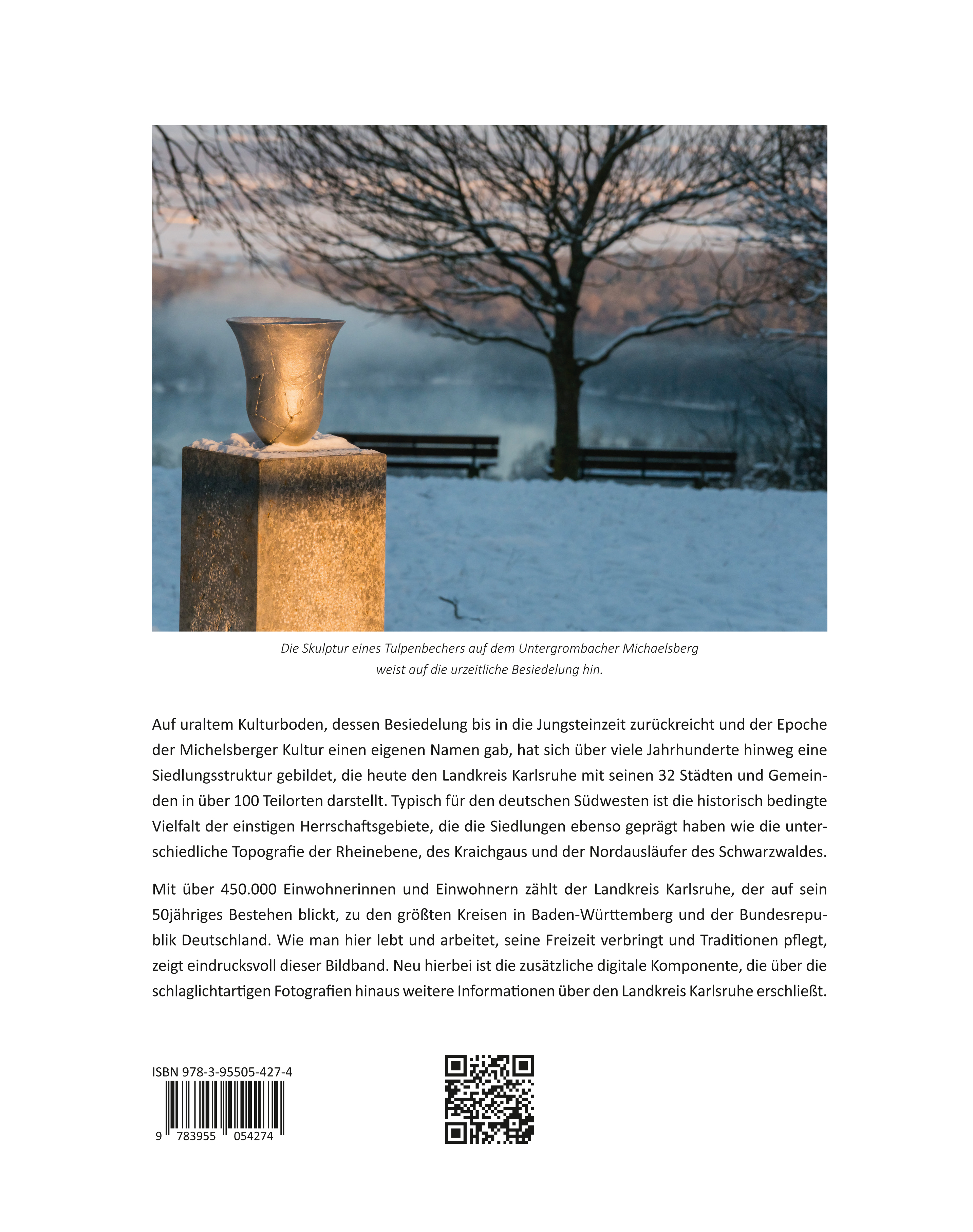 Auf uraltem Kulturboden, dessen Besiedelung bis in die Jungsteinzeit zurückreicht und der Epoche der Michelsberger Kultur einen eigenen Namen gab, hat sich über viele Jahrhunderte hinweg eine Siedlungsstruktur gebildet, die heute den Landkreis Karlsruhe mit seinen 32 Städten und Gemeinden in über 100 Teilorten darstellt. Typisch für den deutschen Südwesten ist die historisch bedingte Vielfalt der einstigen Herrschaftsgebiete, die die Siedlungen ebenso geprägt haben wie die unterschiedliche Topografie der Rheinebene, des Kraichgaus und der Nordausläufer des Schwarzwaldes.Mit über 450.000 Einwohnerinnen und Einwohnern zählt der Landkreis Karlsruhe, der auf sein 50jähriges Bestehen blickt, zu den größten Kreisen in Baden-Württemberg und der Bundesrepublik Deutschland. Wie man hier lebt und arbeitet, seine Freizeit verbringt und Traditionen pflegt, zeigt eindrucksvoll dieser Bildband. Neu hierbei ist die zusätzliche digitale Komponente, die über die schlaglichtartigen Fotografien hinaus weitere Informationen über den Landkreis Karlsruhe erschließt.