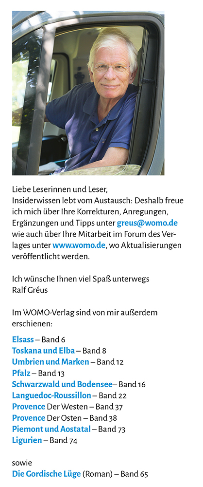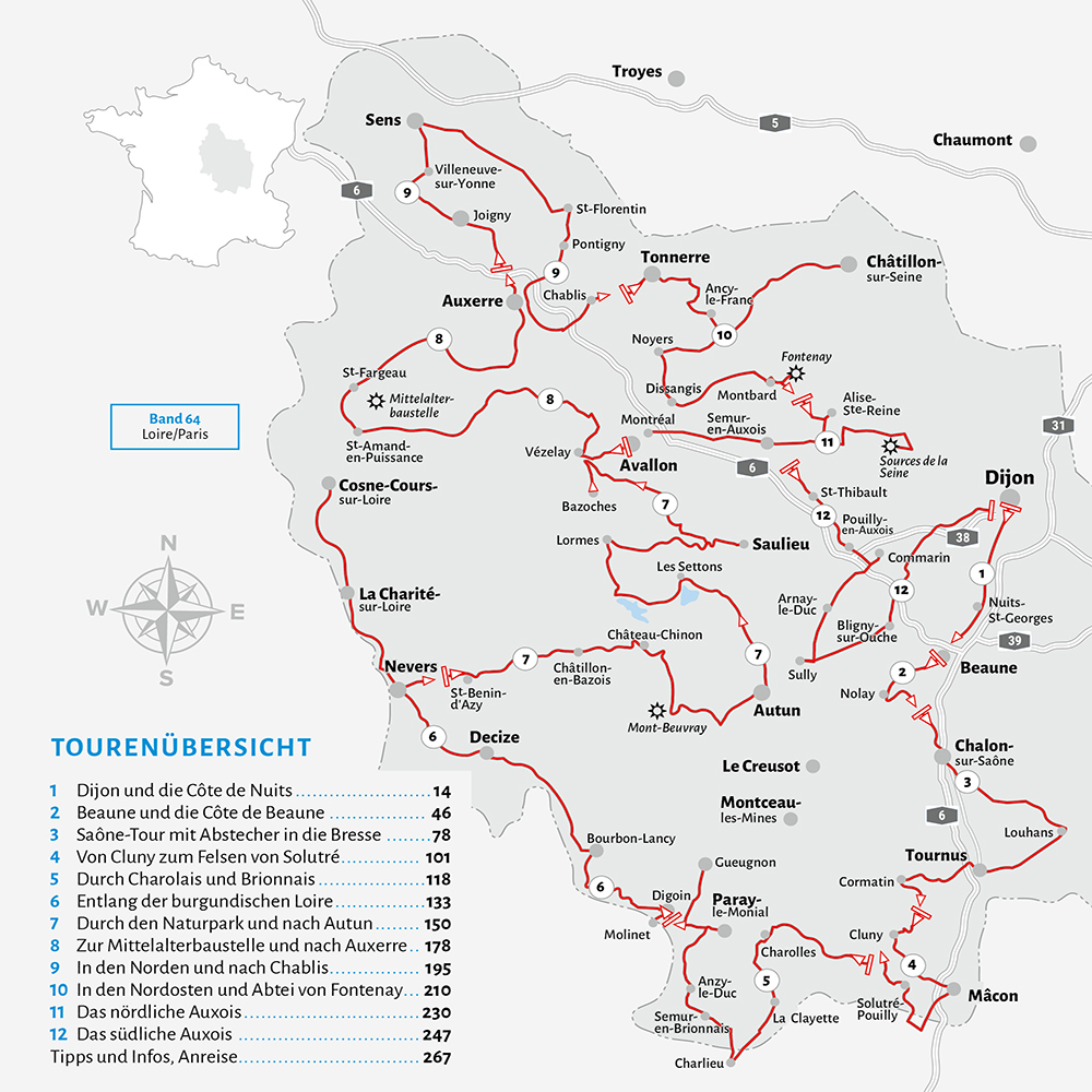 Einladung Wie oft haben Sie auf dem Weg nach Südfrankreich, Spanien oder Portugal schon daran gedacht, in Burgund mehr zu unternehmen, als nur einmalig zu übernachten oder an den Autobahndreiecken bei Beaune die richtige Fahrspur zu finden! Wie sehr hat Sie der Erkundungsdrang gepackt, wenn Sie am Rand der Fernstraßen von Hinweisschildern auf beinahe tausend Jahre alte Kirchen aufmerksam wurden! Und bei fast jeder Reise haben Sie sich geschworen, beim nächsten Mal dem Urlaub ein paar Tage mehr abzuknapsen, um endlich wenigstens einige der Haupt sehenswürdigkeiten einer Region kennenzulernen, die kunst historisch zu den bedeutsamsten in Mitteleuropa zählt. Denn gerade in der Möglichkeit, die Reise unterbrechen zu können, haben Sie sich gesagt, liegt einer der Hauptgründe für eine Wohnmobilreise. So ähnlich waren auch meine Gedanken, bevor ich zur Vorauflage die Aufgabe übernommen habe, für den WOMO-Verlag einen neuen Burgundführer zu schreiben. Und bis ich bemerkt habe, wie fremd- und falschbestimmt unsere Urlaubswünsche sind, wenn wir einen wunderbaren Teil Frankreichs seitwärts liegen lassen, um unsere Ziele in Küstennähe zu suchen. Wer meine Südfrankreichbücher kennt, wird mich nicht der Abwerbung verdächtigen, wenn ich Ihnen verspreche, dass Sie in Burgund kurzweiligere Tage verbringen werden als an manchem Abschnitt am Meer. Planen Sie also mit vorliegendem Reiseführer einen Kurzaufenthalt oder einen ganzen Urlaub in Burgund, erfreuen Sie sich an Kirchen, Klöstern, Schlössern, Wein, Märkten und Küche, an einem Frankreich, das Ihnen hier wirklich wie aus dem Bilderbuch erscheint. Dabei wünsche ich Ihnen viel Freude! Ihr Ralf Gréus