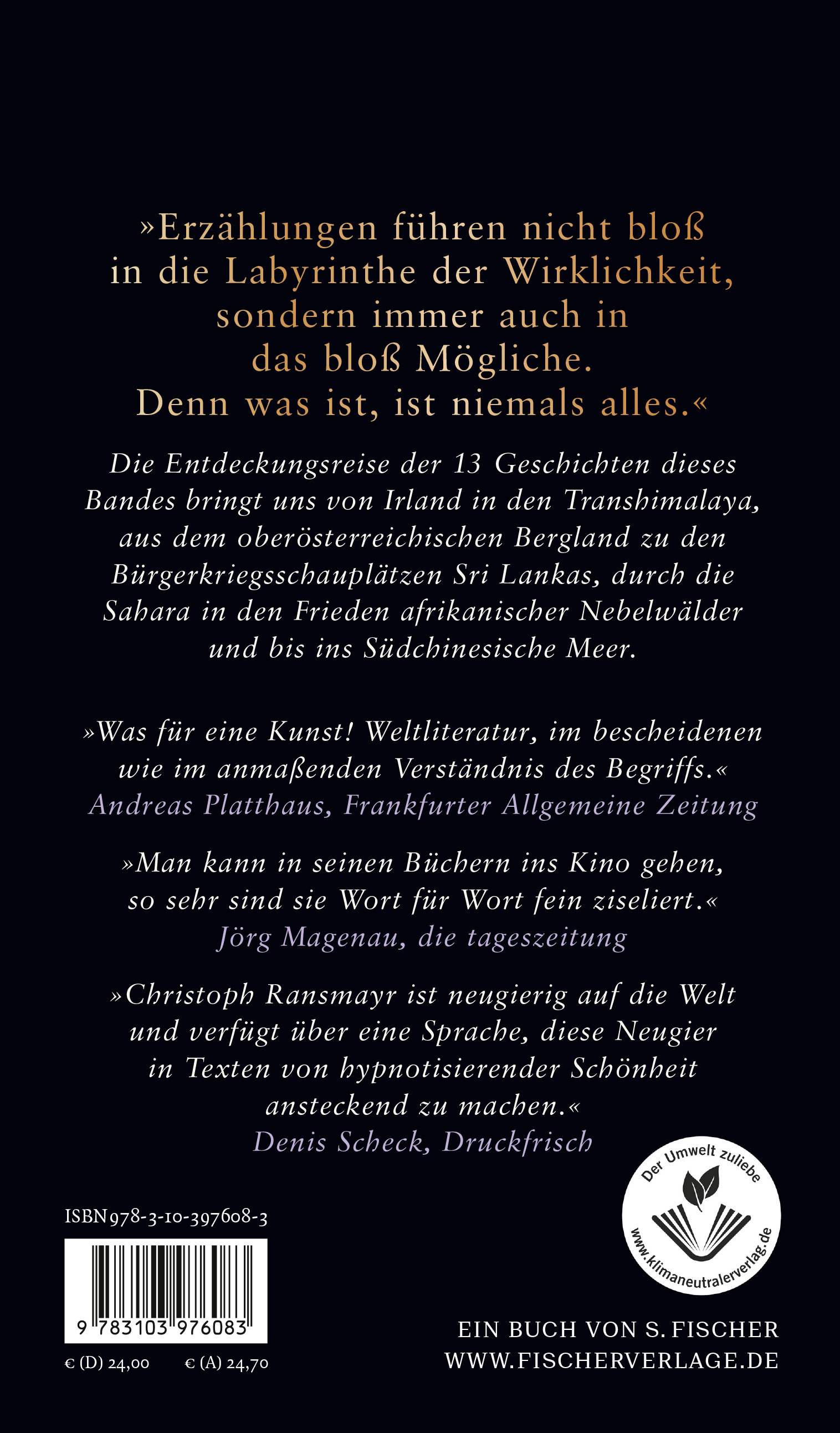 Wer in den zwölf weißen Bänden von Christoph Ransmayrs »Spielformen des Erzählens« nach dem klassischen Ton großer Erzählungen sucht, wird jene 13 Geschichten entdecken, die nun erstmals in einem Band versammelt sind. Die Entdeckungsreise führt von Irland in den Transhimalaya, aus dem oberösterreichischen Bergland zu den Bürgerkriegsschauplätzen Sri Lankas oder in die Sahara, in den Frieden afrikanischer Nebelwälder und ins Südchinesische Meer.