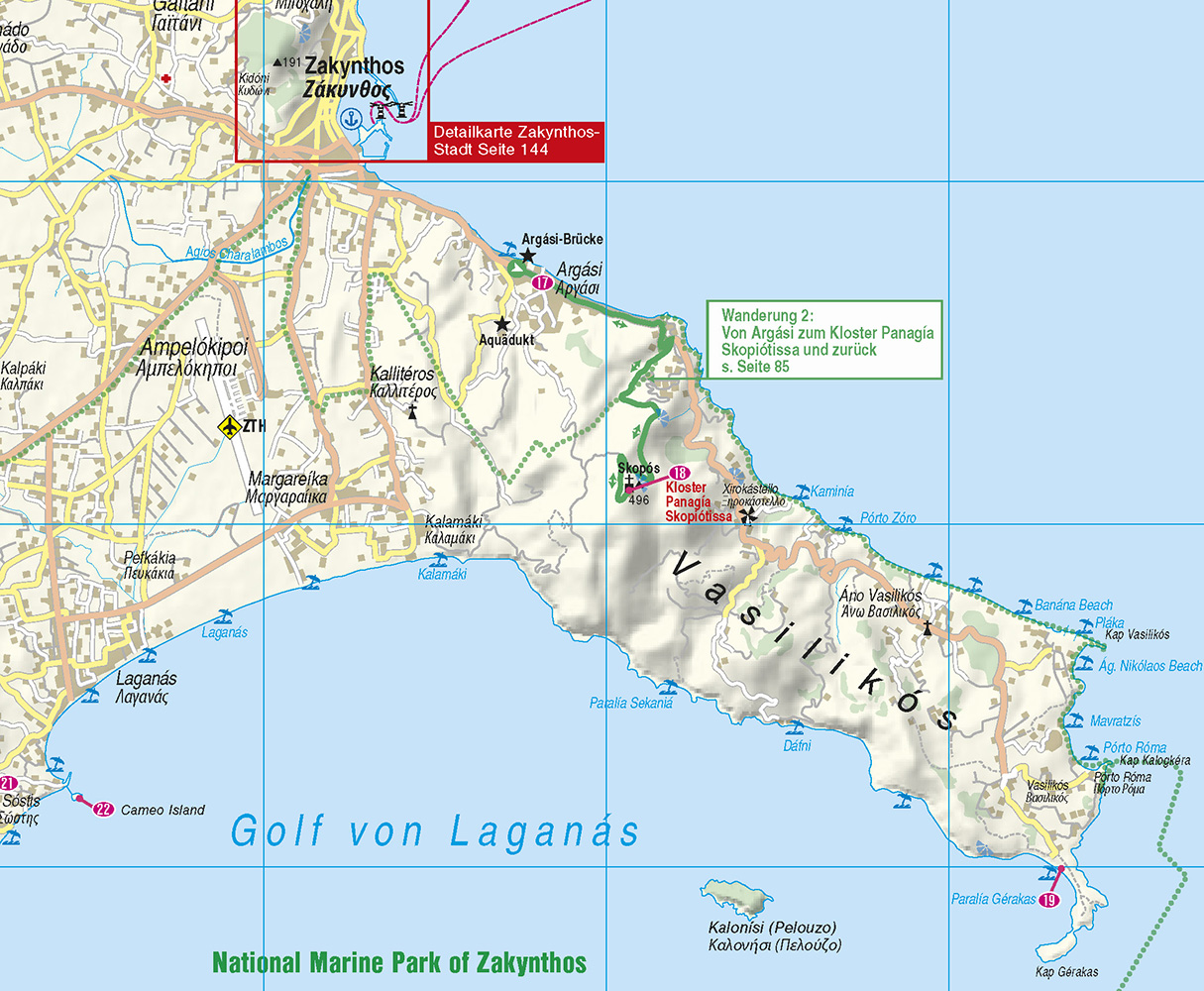 - Inselfaltplan zum Herausnehmen und detaillierter Stadtplan von Zakynthos-Stadt