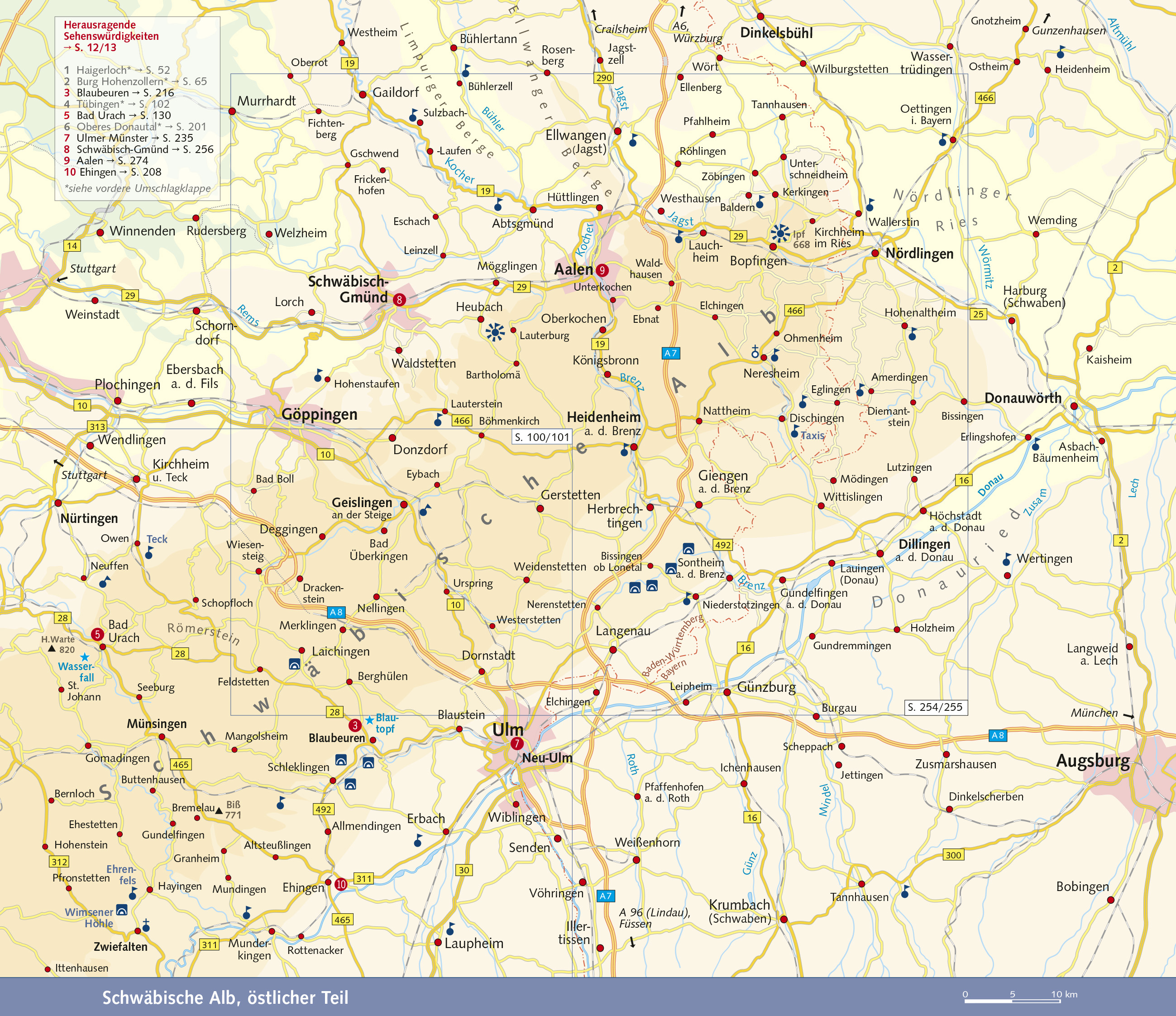 Vorwort 11Herausragende Sehenswürdigkeiten 12Das Wichtigste in Kürze 14Entfernungstabelle 16Unterwegs mit Kindern 17LAND UND LEUTE 21Geographie 22Der Naturraum Schwäbische Alb 24Geologie 26Die Tier- und Pflanzenwelt der Alb 30Bevölkerung und Geschichte 31Die schwäbische Mentalität 31Der schwäbische Dialekt 33Geschichte im Überblick 34Architekturgeschichte 36Bräuche und Feste 38Essen und Trinken 39Aktivitäten 45Fernwanderwege 45Fernradwege 47Die schönsten Zugstrecken 48WESTLICHE ALB 51Zwischen Albtrauf und Blauer Donau 52Haigerloch 52Wanderung Haigerloch: der Römerturm-Rundweg 59Hechingen 60Burg Hohenzollern 65Wanderung am Aussichtspunkt Zeller Horn 68Balingen 71Albstadt-Lautlingen 75Wanderung Traufgang Hossinger Leiter 77Albstadt-Ebingen 80Albstadt-Tailfingen 82Onstmettingen 82Sigmaringen 84Campus Galli 88Burg Wildenstein 89Erzabtei Beuron 90Wanderung Beuron-Hausen im Tal 91Knopfmacherfelsen/Schloss Bronnen 92Kolbinger Höhle 92Freilichtmuseum Neuhausen ob Eck 93Tuttlingen 94MITTLERE ALB 99Tübingen und Umgebung 102Geschichte der Stadt 102Historische Altstadt 104Schloss Hohentübingen 110Kunsthalle Tübingen 111Botanischer Garten 112Kloster und Schloss Bebenhausen 115Wanderung von Tübingen zur Wurmlinger Kapelle 115Reutlingen und Umgebung 118Geschichte 118Altstadt 119Metzingen 127Bad Urach 130Wanderung zum Uracher Wasserfall 135Schönbergturm Pfullingen 136Nebelhöhle 136Schloss Lichtenstein 139Bärenhöhle 140Nürtingen und Umgebung 142Geschichte 142Sehenswertes in Nürtingen 143Neuffen 149Wanderung auf Hölderlins Spuren 149Beuren 151Wanderung von Neuffen nach Beuren 152Kirchheim unter Teck 153Umgebung von Kirchheim unter Teck 159Radtour um Kirchheim 159Göppingen und Umgebung 161Sehenswertes in Göppingen 162Schloss Donzdorf 166Burgruine Hohenstaufen 166Höhlen um Gutenberg und Schopfloch 170Schloss Weißenstein 170Rund um Geislingen an der Steige 171Geschichte 171Sehenswertes in Geislingen 173Bad Überkingen 177Schloss und Wallfahrtskirche Hohenstadt 177Wanderung auf dem Erlebnispfad Geislinger Steige 177Wanderung entlang des Löwenpfads (Steigen-Tour) 177Bad Ditzenbach 178Rund um Wiesensteig und Neidlingen 179Wanderung auf der Filsursprungrunde 181Wanderung auf dem Wiesensteiger Geopfad 181Zwischen Trochtelfingen und Zwiefalten 183Trochtelfingen 183Haupt- und Landgestüt Marbach 184Gedenkstätte Schloss 185Grafeneck 185Münsingen 186Umgebung von Münsingen 189Spazier-Wanderung: "hochgehütet" am Beutenlay 193Großes Lautertal 196Wimsener Wasserhöhle 197Zwiefalten 197Entlang der Donau 201Kloster Obermarchtal 201Munderkingen 202Riedlingen an der Donau 204Freilichtmuseum Heuneburg - Stadt Pyrene 207Ehingen 208Wanderung auf dem Bierwanderweg 212Zwischen Laichingen und Blaubeuren 213Laichingen 213Blaubeuren 216Wanderung auf dem Karstkundlichen Wanderweg 216Kloster Blaubeuren 219Wanderung zur Kleinen Grotte, zum Rusenschloss und zum Knoblauchfelsen 221Schelklingen 222Wanderung rund ums Achtal 222Ulm 224Geschichte 224Südliches Zentrum 229Nördliches Zentrum 234Rund um den Eselsberg 242Friedrichsau 243Ausflug ins bayerische Neu-Ulm 243Wanderung auf dem Festungsweg 250Kloster Wiblingen 251Steinzeitdorf Ehrenstein 251OSTALB 253Schwäbisch Gmünd und Umgebung 256Sehenswertes in Schwäbisch Gmünd 257Wanderung vom Zentrum über die Burg Hohenrechberg bis zur Barockkirche St. Maria 267Wanderung durch das Felse