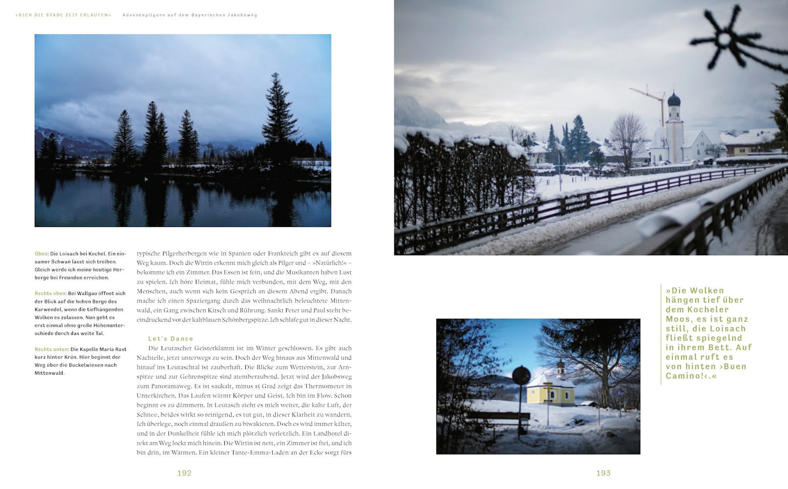 Die im Buch beschriebenen Touren für alle Jahreszeiten reichen von kurzen Wanderungen mit wenigen Stunden Gehzeit bis hin zu knapp zwei Wochen langen Pilgerwegen. Beleuchtet wird dabei vor allem die Bedeutung des Pilgerns als elementarer und tief verwurzelter Bestandteil der Kultur der Alpen. Jeder vorgestellte Weg hat seinen eigenen Charme, sei es durch seine Geschichte, seine Landschaft oder seine spirituelle Bedeutung. Durch atmosphärische Fotografien und authentische Texte wird die transformative Erfahrung des Wanderns auf langen Strecken greifbar.