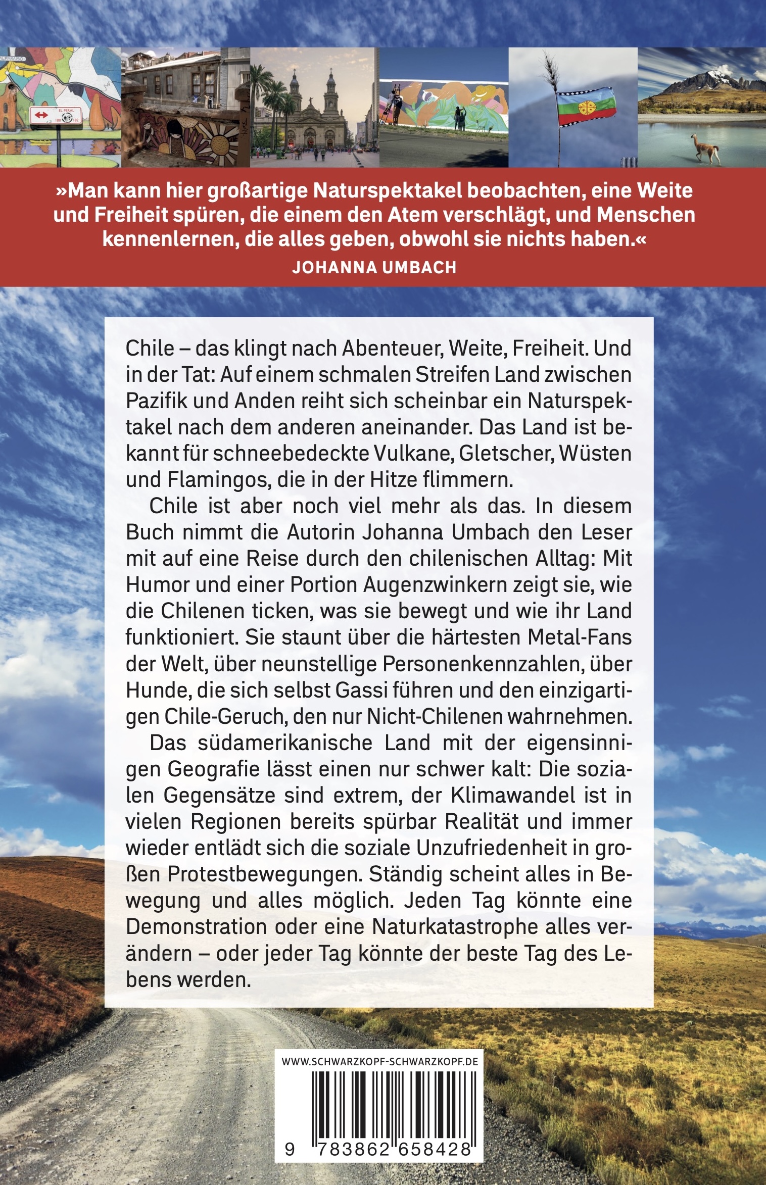 Chile - das klingt nach Abenteuer, Weite, Freiheit. Und in der Tat: Auf einem schmalen Streifen Land zwischen Pazifik und Anden reiht sich scheinbar ein Naturspektakel nach dem anderen aneinander. Das Land ist bekannt für schneebedeckte Vulkane, Gletscher, Wüsten und Flamingos, die in der Hitze flimmern. Chile ist aber noch viel mehr als das. In diesem Buch nimmt die Autorin Johanna Umbach den Leser mit auf eine Reise durch den chilenischen Alltag: Mit Humor und einer Portion Augenzwinkern zeigt sie, wie die Chilenen ticken, was sie bewegt und wie ihr Land funktioniert. Sie staunt über die härtesten Metal-Fans der Welt, über neunstellige Personenkennzahlen, über Hunde, die sich selbst Gassi führen und den einzigartigen Chile-Geruch, den nur Nicht-Chilenen wahrnehmen. Das südamerikanische Land mit der eigensinnigen Geografie lässt einen nur schwer kalt: Die sozialen Gegensätze sind extrem, der Klimawandel ist in vielen Regionen bereits spürbar Realität und immer wieder entlädt sich die soziale Unzufriedenheit in großen Protestbewegungen. Ständig scheint alles in Bewegung und alles möglich. Jeden Tag könnte eine Demonstration oder eine Naturkatastrophe alles verändern - oder jeder Tag könnte der beste Tag des Lebens werden.»Man kann hier großartige Naturspektakel beobachten, eine Weite und Freiheit spüren, die einem den Atem verschlägt, und Menschen kennenlernen, die alles geben, obwohl sie nichts haben.« Johanna Umbach