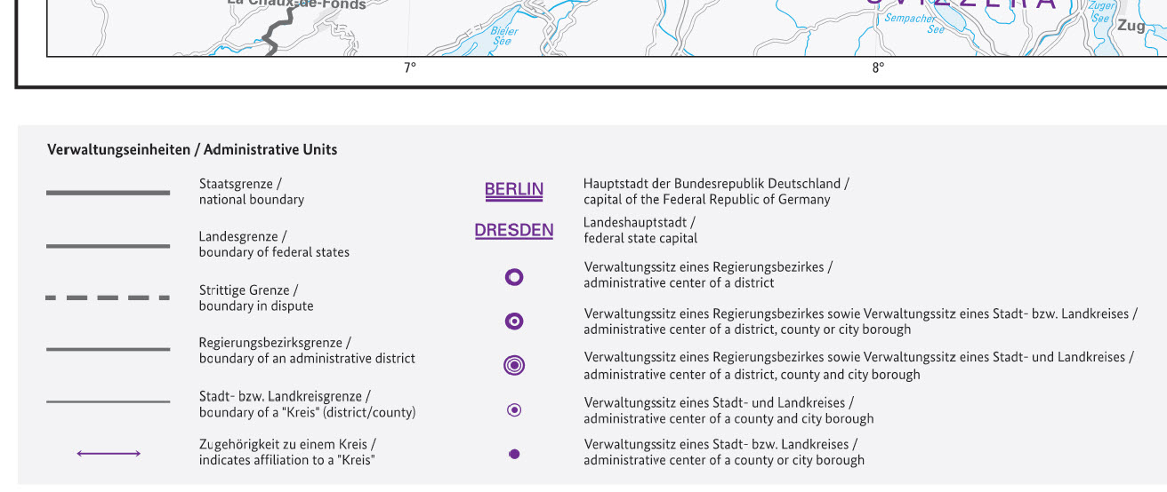 Wandkarte auf Hochglanzpapier mit Aufhänger und Bestäbung. Maßstab 1:750 000. Auf einer Kartenfläche von 96 cm x 137 cm (Breite x Höhe) bildet die Karte die Verwaltungsgliederung Deutschlands von der Staatsgrenze bis zur Kreisgrenze ab. Die Bundesländer werden in unterschiedlichen Flächenfarben präsentiert. Neben den Verwaltungssitzen werden unter anderem Verkehrswege (Schienenverkehr, Autobahnen, Bundes- und Landesstrassen mit Strassennummer), Namen (Orte, Gewässer, Berge, Landschaften, Länder)Gewässer, Höhenpunkte, Flughafen-Signaturen, Kartengitternetz, Straßennummern und eine zweisprachige Legende in Deutsch und Englisch gezeigt.Die Karte ist auch ohne Aufhänger und Bestäbung mit der ISBN 978-3-86482-142-4 erhältlich.