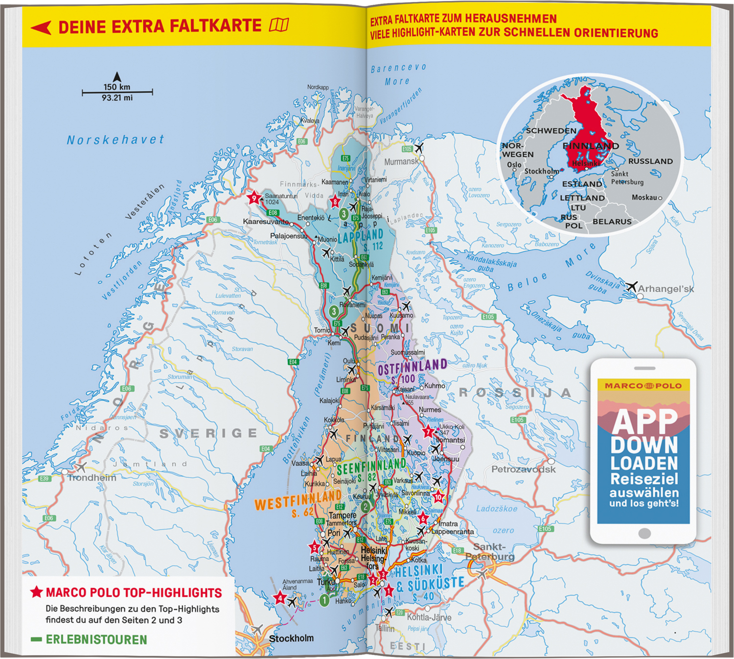 Wer Ruhe sucht, ist in Finnland genau richtig. Menschen triffst du hauptsächlich in den Städten und auf den zahlreichen Festivals. Außerhalb sind die Rentiere oft in der Überzahl. Genieße die frische Luft bei einer Wanderung durch die dichten Wälder und halte nach Wölfen, Adlern und Fischottern Ausschau. Oder schnapp dir ein Boot und zähle mit, wie viele der über hunderttausend Seen du errudern kannst. Lass dich von den Tipps und Empfehlungen in deinem MARCO POLO Reiseführer für Finnland inspirieren und mach deinen Urlaub im hohen Norden zu einem Erlebnis, das du nie vergisst!