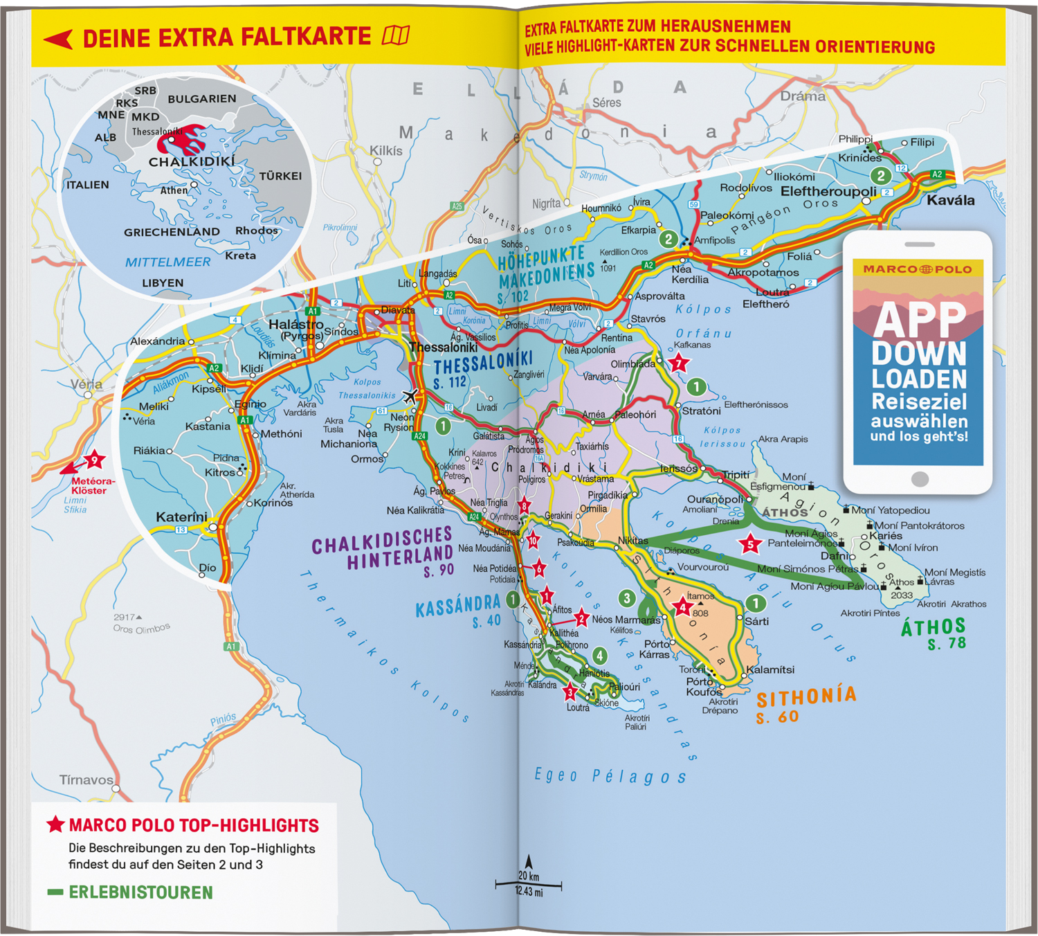 Grün und Blau siehst du in der Chalkidikí überall, egal ob du vor der Küste Kassándras Wracktauchen gehst, durch die Kiefernwälder Sithonías streifst oder vom Schiff aus einen Blick auf die Mönchsklöster von Áthos wirfst. Das ist dir nicht genug Farbenspiel? Dann stöbere auf den bunten Märkten von Thessaloníki und mache in stylischen Beachbars die Nacht zum Tag! Ob Strandtag oder Ausflug in die Natur - mit deinem MARCO POLO Reiseführer für die Chalkidikí bist du für alles bestens gerüstet!