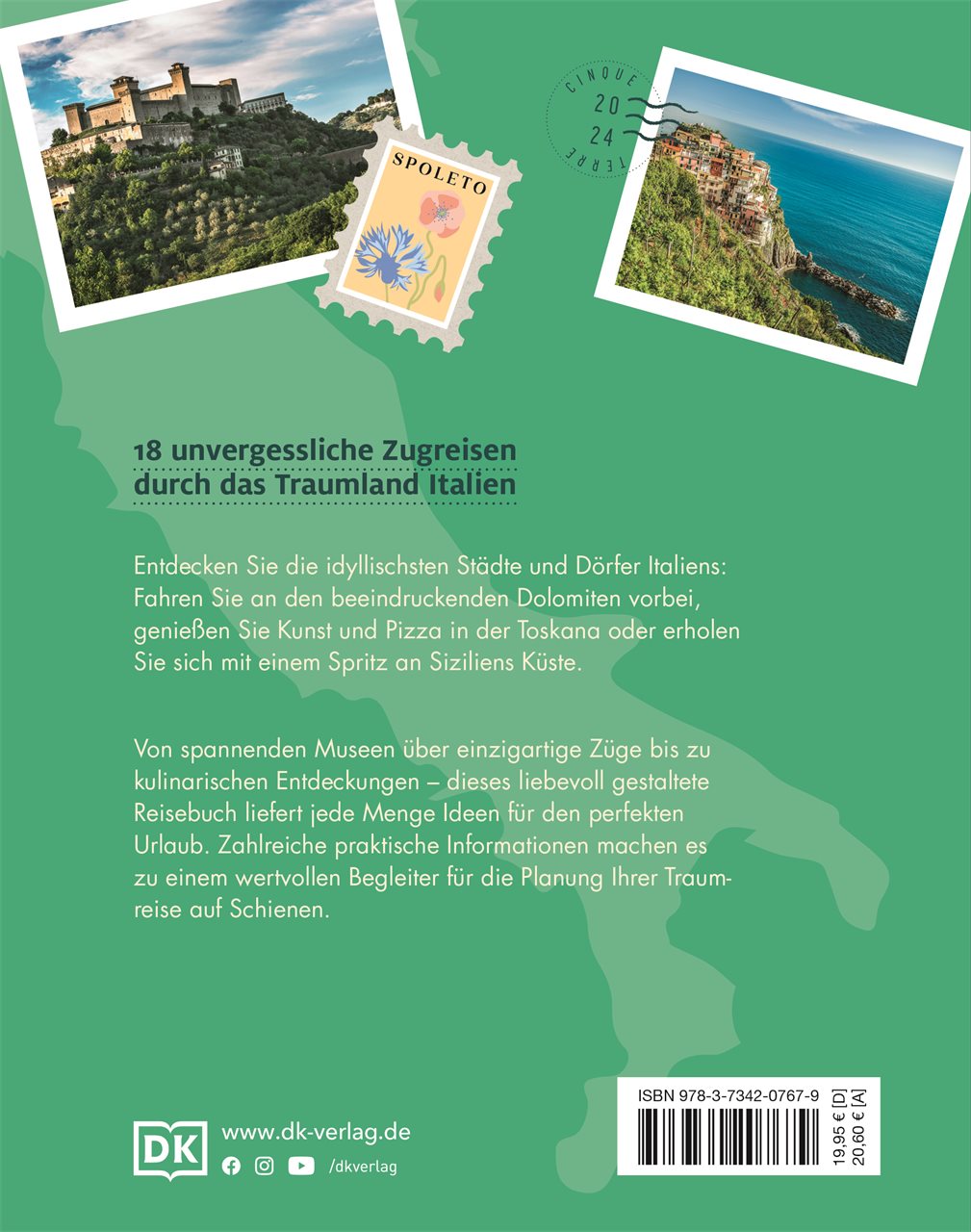 Ob 5 Tage oder 2 Wochen, ob in den Bergen oder am Meer, ob quer durch die Abruzzen oder die Lombardei, oder eine Rundreise durch Sizilien, Sardinien oder die Toskana: Umfangreich bebildert, präsentiert Ihnen das Reisebuch "Urlaub mit dem Zug" 18 einzigartige Bahnreisen, die Sie in geschichtsträchtige Städte, in charmante Dörfer oder zu den verborgenen Schätzen Italiens bringen, z.B. 7 Tage Latium mit Rom, Tivoli, Frascati, Gaeta und Sperlonga, 10 Tage Dolomiten mit Bozen, Ritten, Brixen, Plaus, Bruneck, Kronplatz, Innichen, Helm, Drei Zinnen und Haunold oder 13 Tage Apulien mit Bari, Monopoli, Ostuni, Brindisi, Lecce, Martina Franca, Alberobello, Bari, Altamura und Matera.