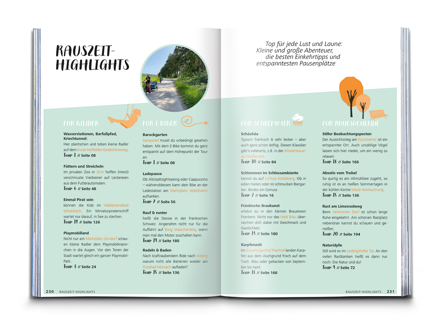 Bei der Tourenauswahl helfen Highlight-Listen für Kinder, E-Biker, Schlemmer und Ruhesuchende. Dank Eventkalender planst du deine Route immer zur besten Zeit und mit Radcheck und Packliste bist du bestens gerüstet fürs Heimat- oder Urlaubsabenteuer. Jede Tour wird ergänzt um Einkehrtipps, Anreiseinfos, Höhenprofil und Tourenkarte.