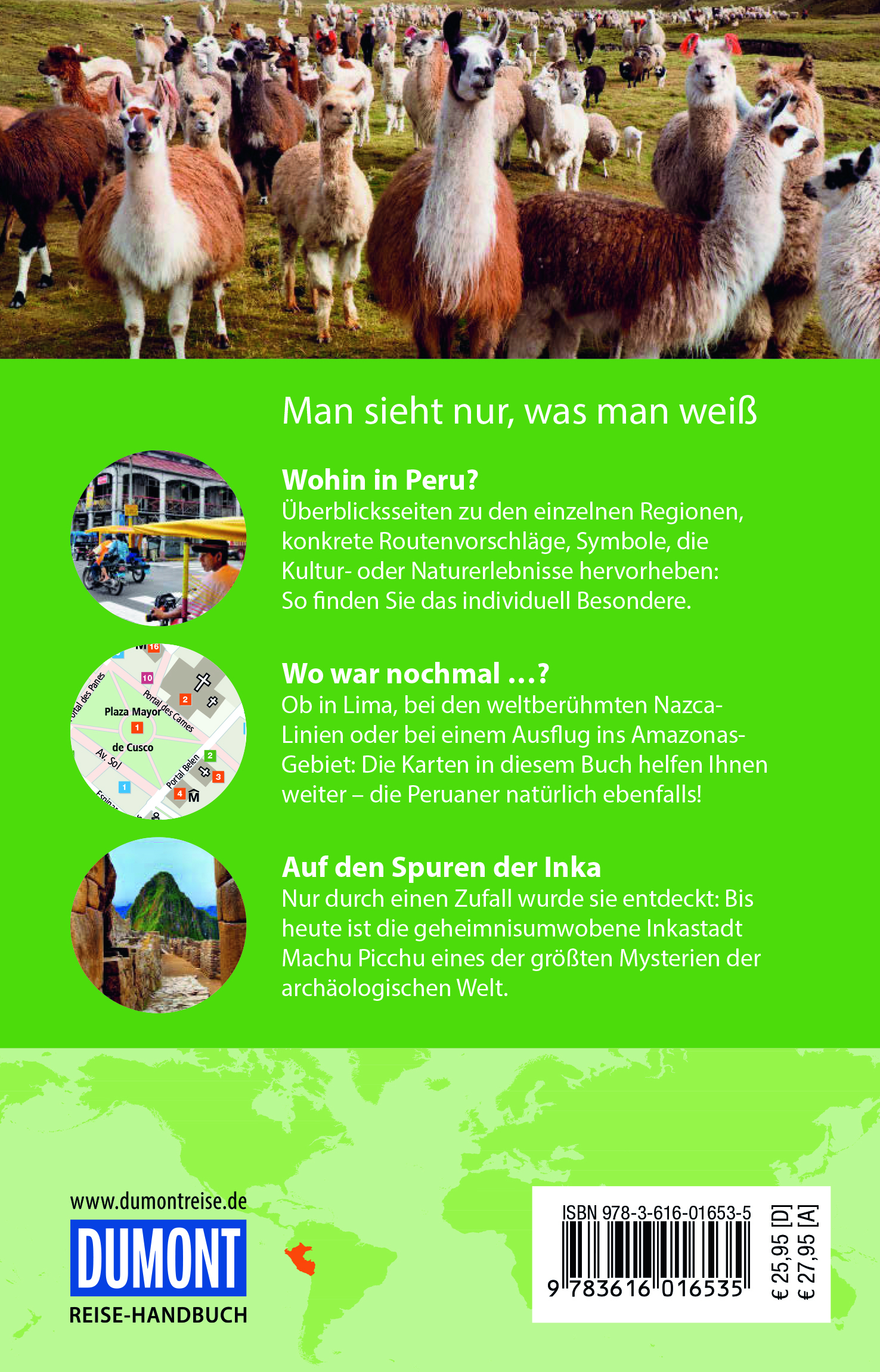 Costa, Sierra und Selva - die drei faszinierenden Facetten der peruanischen Natur lassen das Herz von Entdeckern und Abenteurern höherschlagen. Es ist ein Land der Kontraste mit gelbbraunen Wüsten gleich neben dem tiefblauen Pazifik, tropischen Flusstälern des Amazonas mit ihrem erstaunlichen Artenreichtum und der wild zerklüfteten Bergwelt der Anden. Hier lässt sich das Erbe von tausendjährigen Zivilisationen an archäologischen Stätten wie der berühmten Inka-Zitadelle Machu Picchu erleben. Das DuMont Reise-Handbuch führt Sie in die atemberaubende Natur und zu den sehenswertesten Orten des Landes, die Ihnen Peru und seine Bewohner wirklich nahebringen.
