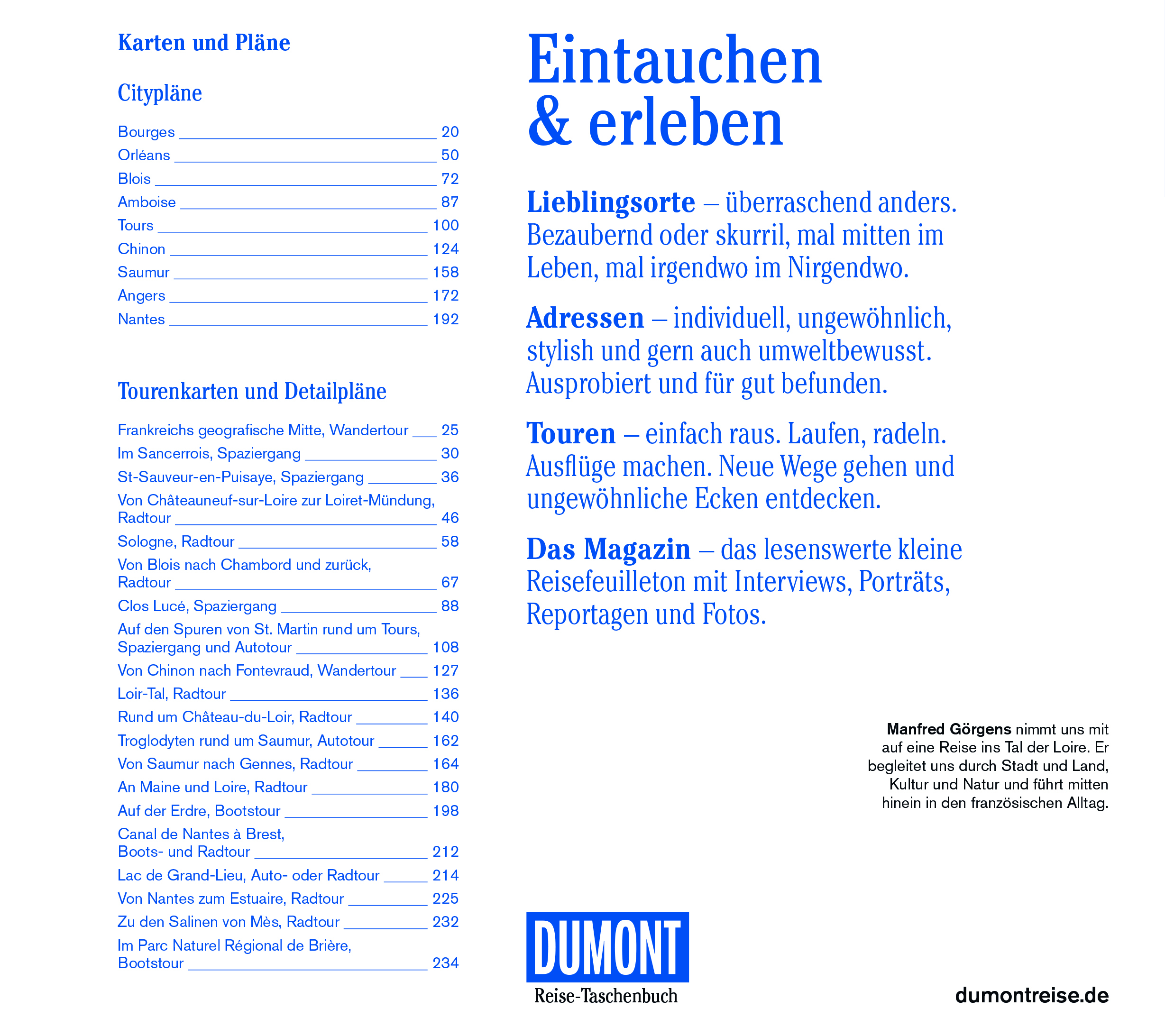 Senkrechtstarter, Überflieger, Querfeldein. Vor Ort - die Kapitel: Im Berry, Zwischen Gien und Blois, Tours und Touraine, Val du Loir, Das Anjou, Nantes, An der Loire-Mündung. Das Kleingedruckte (Reiseinfos von A bis Z). Das Magazin. Offene Fragen.