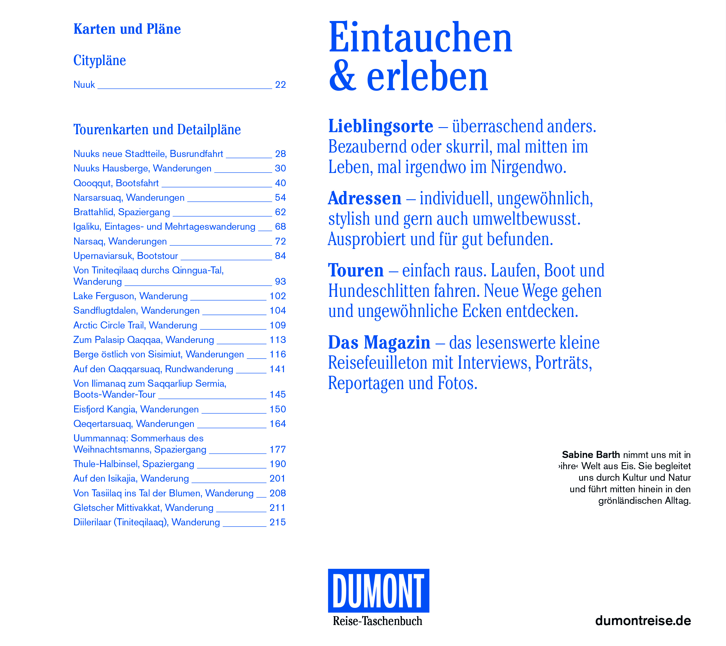 Das Interesse an den Polarregionen hat in den letzten Jahren stark zugenommen, immer häufiger wird Grönland, die größte Insel der Welt, Ziel von Urlaubsreisen. Besonders im Fokus stehen Grönlands Riesengletscher, die an den Rändern des kilometerdicken Inlandeisschildes unter berstendem Krachen ins Eismeer kalben. Scheinbar schwerelos treiben die dabei losgelösten haushohen Eisberge beispielsweise durch den Kangia-Fjord aufs offene Meer. Gleich auf den ersten Seiten des DuMont Reise-Taschenbuchs Grönland verrät die Autorin Sabine Barth, wie und wo man dem Eis besonders nahe kommt, und erklärt, wie man die kalte Insel auch individuell bereisen kann. Zu den persönlichen Lieblingsorten der Autorin gehört der Friedhof mit Aussicht in Upernavik und das Versammlungshaus in Aasiaat mit einem Gemälde von Per Kirkeby. Ein besonderes Plus des Reiseführers sind die vielen Aktivtouren, wie z. B. eine Wanderung auf den Berg Ukkusissat, mit Wanderbeschreibungen und Detailkarten. Aber auch für Schiffsreisende ist das Buch lesenswert, da in der aktuellen Auflage die Ankerplätze der Kreuzfahrtschiffe in Ostgrönland beschrieben sind.