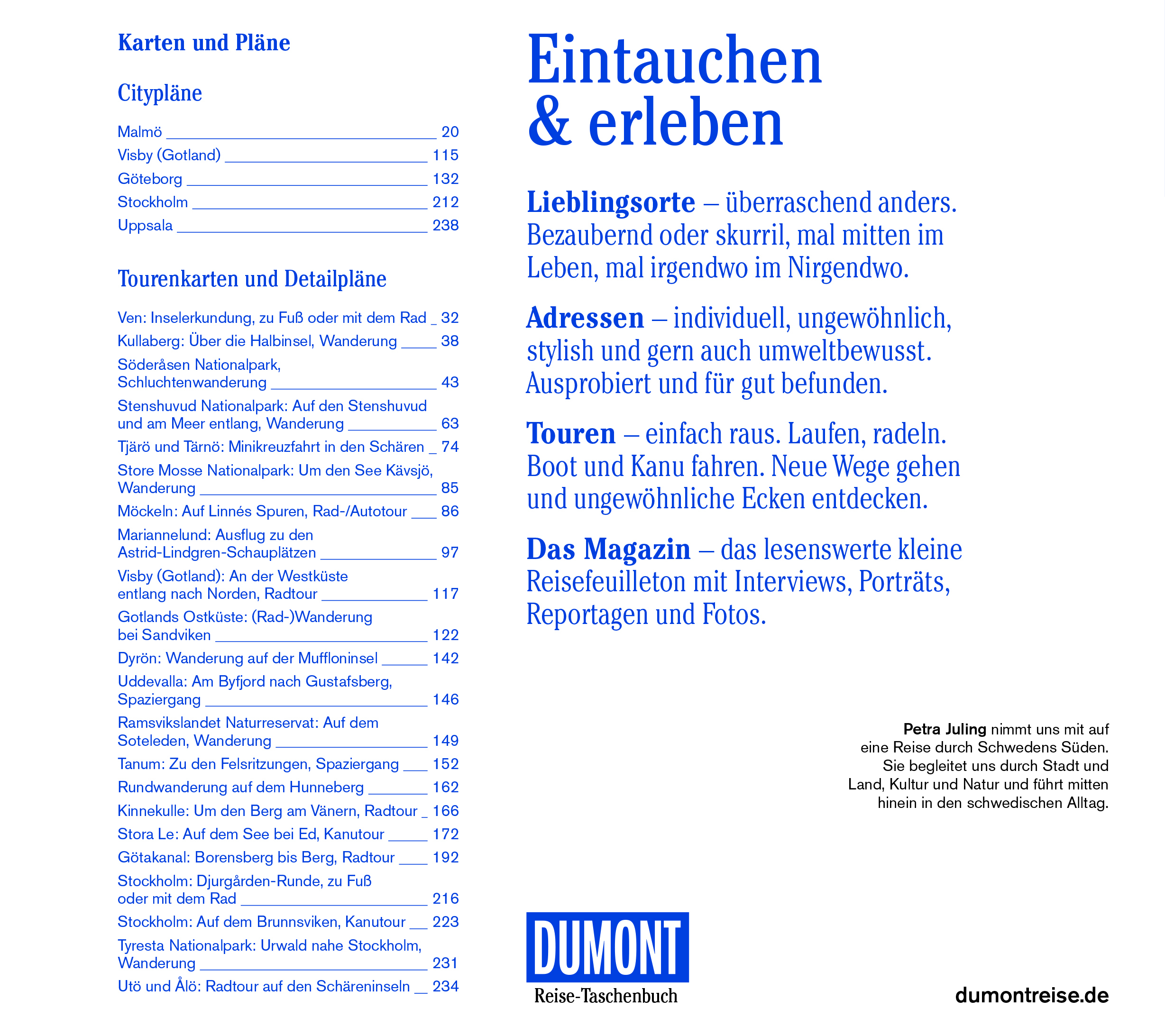 Senkrechtstarter, Überflieger, Querfeldein. Vor Ort - die Kapitel: West-Skåne und Halland, Ost-Skåne und Blekinge, Småland und Öland, Gotland, Göteborg und Bohuslän, Vänersee und Dalsland, Vom Vättersee zum Mälarsee, Stockholm und Umland. Das Kleingedruckte (Reiseinfos von A bis Z). Das Magazin.