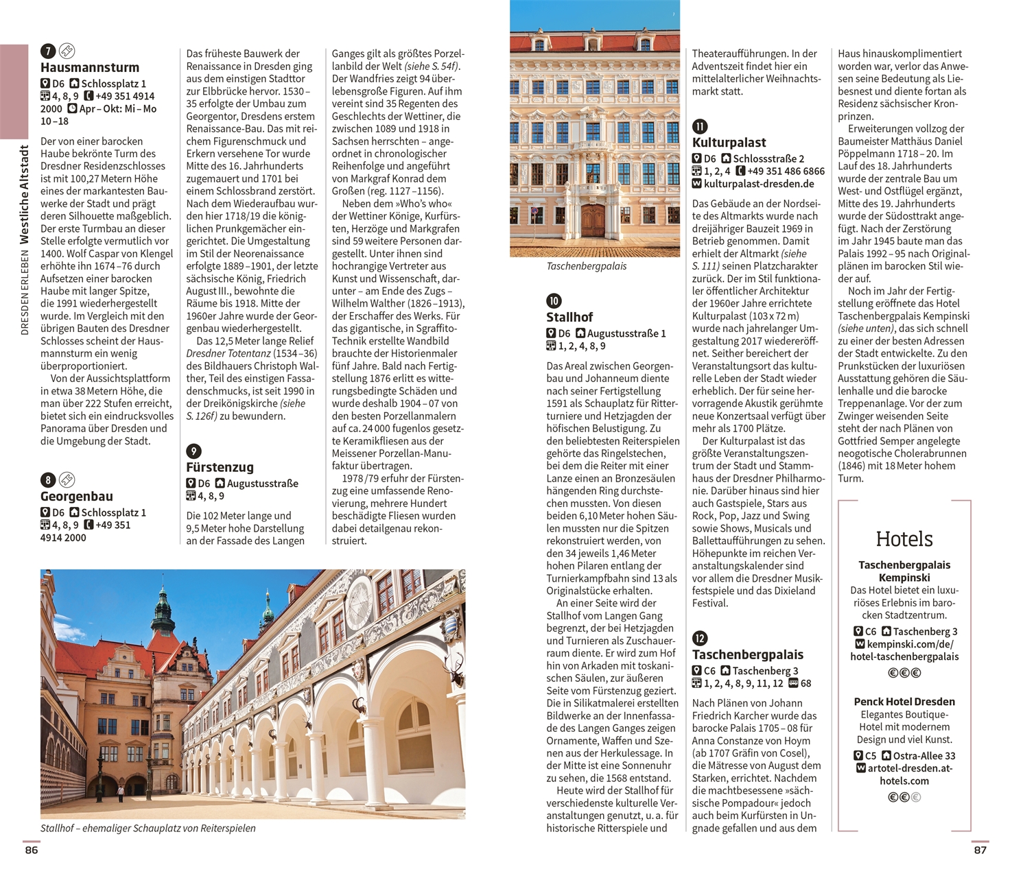 - Ausgewählte Top-Themen: Auf den bildgewaltigen Themenseiten des Dresden-Reiseführers stehen charakteristische Besonderheiten im Fokus. Entdecken Sie unglaubliche Architektur, prächtige Schlösser, vielfältige Unternehmungen und Ideen für Outdoor-Aktivitäten, unter anderem zwei Wanderungen.