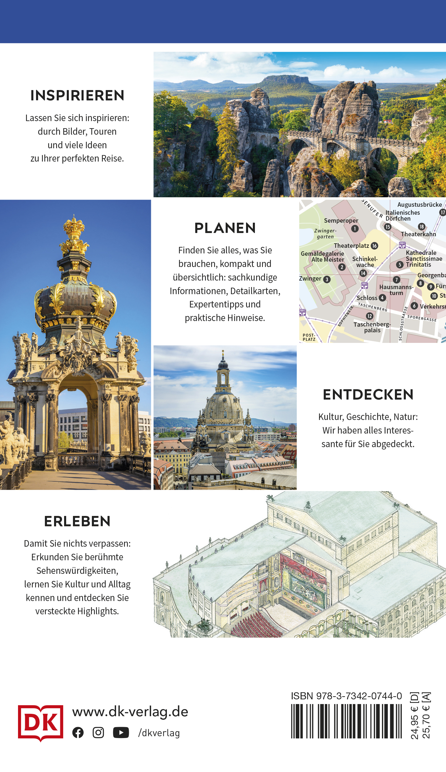- Dresden wartet auf Sie: Entdecken Sie die Westliche Altstadt mit ihren beeindruckenden Highlights wie der Semperoper, der Gemäldegalerie Alte Meister, dem Zwinger oder dem Schloss, fahren Sie mit der Standseilbahn in Loschwitz, besuchen Sie die Winzerorte an der malerischen Sächsischen Weinstraße und unternehmen Sie Abstecher nach Schloss Moritzburg, Schloss Pillnitz oder in die historische Stadt Meißen. Lassen Sie sich von dem praktischen und informativen Dresden-Reiseführer zu den schönsten Erlebnissen, Attraktionen und Sehenswürdigkeiten der Region führen und tauchen Sie ein, in die unendliche Fülle an kulturellen Schätzen, die Dresden und seine Umgebung für Sie bereithält.
