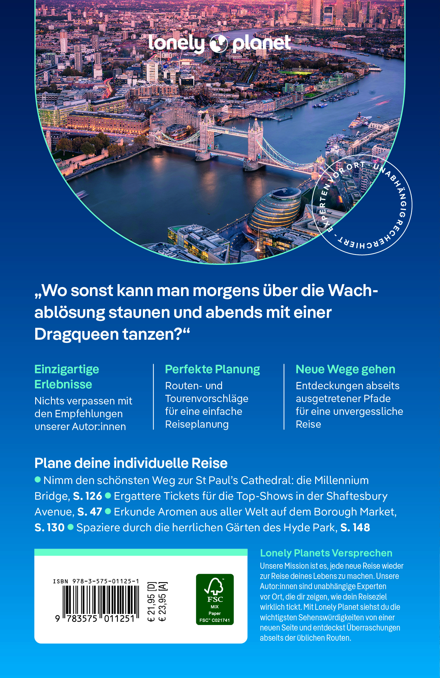Mit dem Lonely Planet London auf eigene Faust durch das die britische Hauptstadt. Etliche Monate Recherche stecken im Kultreiseführer für Individualreisende. Auf fast 400 Seiten geben die Autoren sachkundige Hintergrundinfos zur Stadt, liefern Tipps und Infos für die Planung der Reise, beschreiben alle interessanten Sehenswürdigkeiten und präsentieren ihre persönlichen Entdeckungen und Tipps. Erleben Sie die Stadt, die so viel zu bieten hat: Erfahren Sie alles, was man wissen muss über Tradition und Trends, Shops & Style der wohl spannendsten Stadt Europas. Themsenflair und Teekultur, Weltklasse-Museum, Musicals, Märkte und erholsame Parks. Riskieren Sie einen Blick vom London Eye auf die Stadt, schwimmen Sie in den Badeseen der Hampstead Heath und lassen Sie den Abend in einem der Pubs ausklingen. Und dann ist da noch das Essen: von Fish & Chips über die ganze Bandbreite ethnischer Küchen bis hin zum Restaurant berühmter Spitzenköche. Mit Liebe und Detail haben die Autoren ihre Informationen gesammelt und für jeden Geschmack und Geldbeutel zusammengetragen. Der Lonely-Planet- Reiseführer London ist ehrlich, praktisch, witzig geschrieben und liefert inspirierende Eindrücke und Erfahrungen.