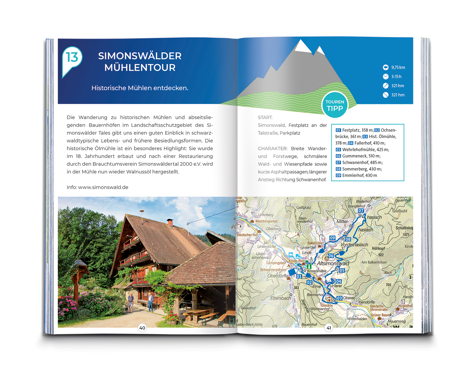 Besser vorher schon wissen, was es zu sehen gibt: Alle 45 Natur- und Wanderhighlights findest du im kompakten Reiseführer Inspiration Schwarzwald. Wasserfälle, einsame Buchten, atemberaubende Aussichten oder einmalige Bergdörfer. Wer will solche Geheim-Tipps nicht schon vor der Reise erfahren? Perfekt für die Urlaubsplanung. So bekommt man schnell einen Überblick, wie man das Beste aus dem Urlaub oder Kurzurlaub macht. Dabei liegt der Fokus voll auf der Natur und einem Aktiv-Urlaub. Vorgestellt werden alle Ziele mit der dazu passenden Wandertour. Eingezeichnet in einer Karte, kompakt beschrieben und mit einem Foto ausgestattet bekommst du schnell einen schönen Eindruck was dich erwartet.